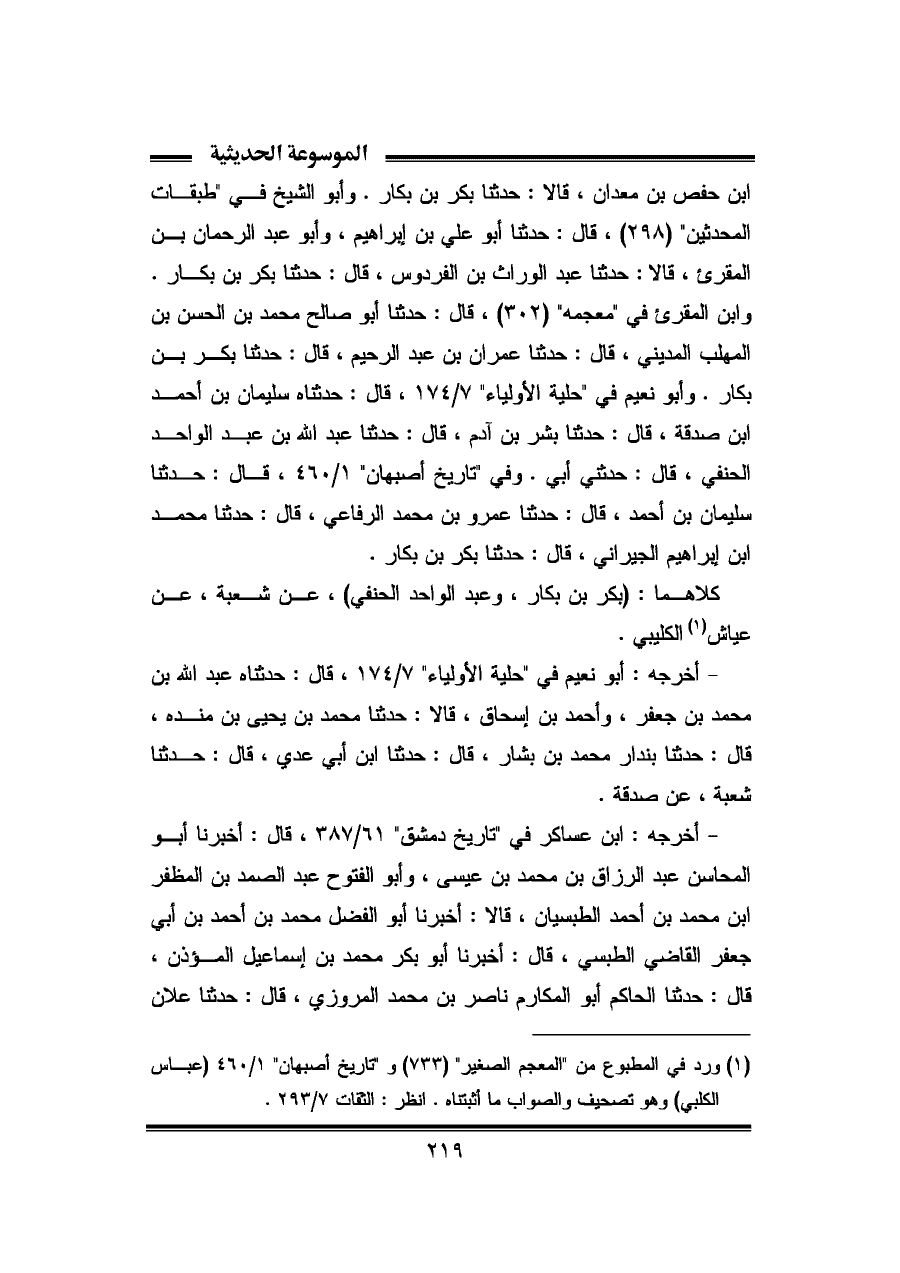 ابن حفص بن معدان، قال: حدثنا بكر بن بكار. وأبو الشيخ في "طبقات المحدثين" (٢٩٨)، قال: حدثنا أبو علي بن إبراهيم، وأبو عبد الرحمان بن المقرئ، قال: حدثنا عبد الوراث بن الفردوس، قال: حدثنا بكر بن بكار. وابن المقرئ في "معجمه" (٣٠٢)، قال: حدثنا أبو صالح محمد بن الحسن بن المهلب المديني، قال: حدثنا عمران بن عبد الرحيم، قال: حدثنا بكر بن بكار. وأبو نعيم في "حلية الأولياء" ٧/ ١٧٤، قال: حدثناه سليمان بن أحمد بن صدقة، قال: حدثنا بشر بن آدم، قال: حدثنا عبد الله بن عبد الواحد الحنفي، قال: حدثني أبي. وفي "تاريخ أصبهان" ١/ ٤٦٠، قال: حدثنا سليمان بن أحمد، قال: حدثنا عمرو بن محمد الرفاعي، قال: حدثنا محمد بن إبراهيم الجيراني، قال: حدثنا بكر بن بكار.