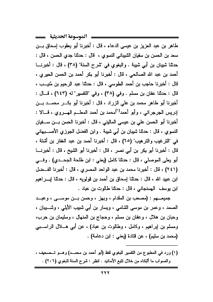 طاهر بن عبد العزيز بن عيسى الدعاء، قال: أخبرنا أبو يعقوب إسحاق بن سعد بن الحسن بن سفيان الشيباني النسوي، قال: حدثنا جدي الحسن، قال: حدثنا شيبان بن أبي شيبة. والبغوي في "شرح السنة" (٣٨)، قال: أخبرنا أحمد بن عبد الله الصالحي، قال: أخبرنا أبو بكر أحمد بن الحسن الحيري، قال: أخبرنا حاجب بن أحمد الطوسي، قال: حدثنا عبد الرحيم بن مُنيب، قال: حدثنا عفان بن مسلم. وفي (٣٨)، وفي "التفسير" له (٦٤٣)، قال: أخبرنا أبو طاهر محمد بن علي الزراد، قال: أخبرنا أبو بكر محمد بن إدريس الجرجرائي، وأبو أحمد (¬١) محمد بن أحمد المعلم الهروي، قال: أخبرنا أبو الحسن علي بن عيسى الماليني، قال: أخبرنا الحسن بن سفيان النسوى، قال: حدثنا شيبان بن أبي شيبة. وابن الفضل الجوزى الأصبهاني في "الترغيب والترهيب" (٦٥)، قال: أخبرنا أحمد بن عبد الغفار بن أشتة، قال: أخبرنا أبو بكر بن أبي نصر، قال: أخبرنا أبو الشيخ، قال: أخبرنا أبو يعلى الموصلي، قال: حدثنا كامل (يعنى: ابن طلحة الجحدي). وفي (٢٤١)، قال: أخبرنا محمد بن عبد الواحد المصري، قال: أخبرنا الفضل بن عبيد الله، قال: حدثنا إسحاق بن أحمد بن قولويه، قال: حدثنا إبراهيم بن يوسف الهسنجاني، قال: حدثنا طالوت بن عباد.
