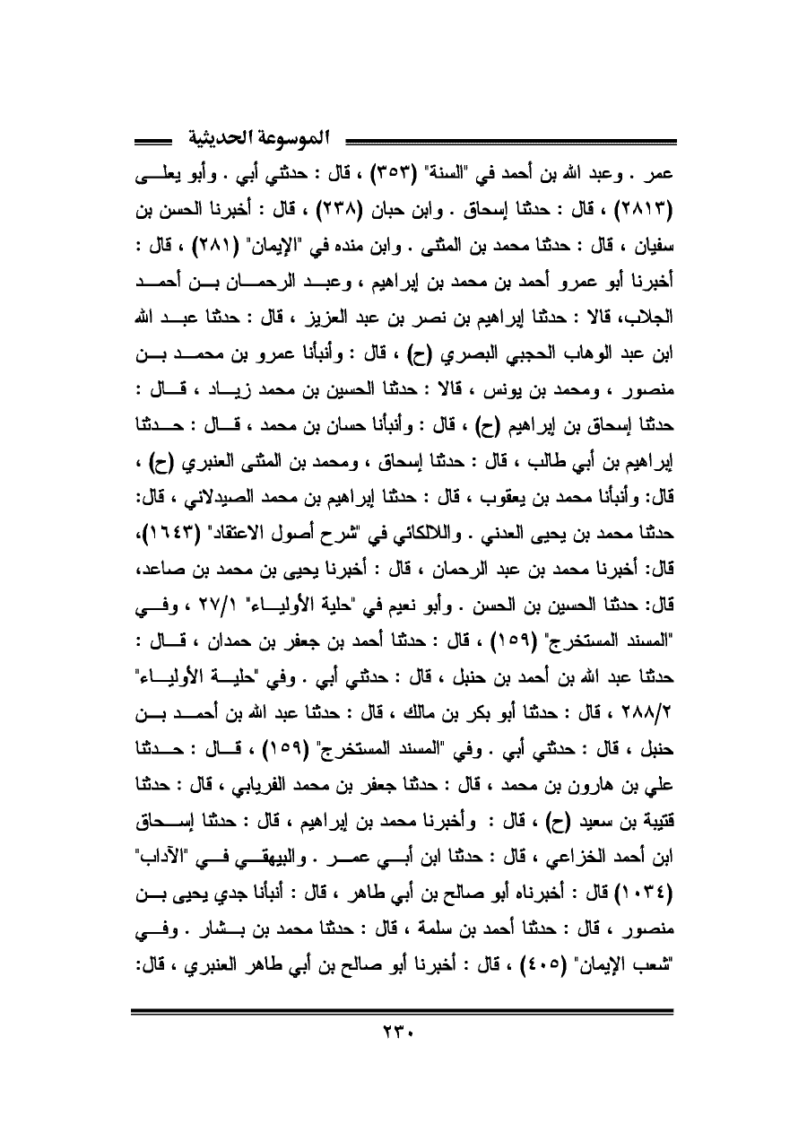 عمر. وعبد الله بن أحمد في "السنة" (٣٥٣)، قال: حدثنى أبي. وأبو يعلى (٢٨١٣)، قال: حدثنا إسحاق. وابن حبان (٢٣٨)، قال: أخبرنا الحسن بن سفيان، قال: حدثنا محمد بن المثنى. وابن منده في "الإيمان" (٢٨١)، قال: أخبرنا أبو عمرو أحمد بن محمد بن إبراهيم، وعبد الرحمان بن أحمد الجلاب، قال: حدثنا إبراهيم بن نصر بن عبد العزيز، قال: حدثنا عبد الله بن عبد الوهاب الحجبي البصري (ح)، قال: وأنبأنا عمرو بن محمد بن منصور، ومحمد بن يونس، قال: حدثنا الحسين بن محمد زياد، قال: حدثنا إسحاق بن إبراهيم (ح)، قال: وأنبأنا حسان بن محمد، قال: حدثنا إبراهيم بن أبي طالب، قال: حدثنا إسحاق، ومحمد بن المثنى العنبري (ح)، قال: وأنبأنا محمد بن يعقوب، قال: حدثنا إبراهيم بن محمد الصيدلاني، قال: حدثنا محمد بن يحيى العدني. واللالكائي في "شرح أصول الاعتماد" (١٦٤٣)، قال: أخبرنا محمد بن عبد الرحمان، قال: أخبرنا يحيى بن محمد بن صاعد، قال: حدثنا الحسين بن الحسن. وأبو نعيم في "حلية الأولياء" ١/ ٢٧، وفي "المسند المستخرج" (١٥٩)، قال: حدثنا أحمد بن جعفر بن حمدان، قال: حدثنا عبد الله بن أحمد بن حنبل، قال: حدثني أبي. وفي "حلية الأولياء" ٢/ ٢٨٨، قال: حدثنا أبو بكر بن مالك، قال: حدثنا عبد الله بن أحمد بن حنبل، قال: حدثني أبي. وفي "المسند المستخرج" (١٥٩)، قال: حدثنا علي بن هارون بن محمد، قال: حدثنا جعفر بن محمد الفريابي، قال: حدثنا قتيبة بن سعيد (ح)، قال: وأخبرنا محمد بن إبراهيم، قال: حدثنا إسحاق بن أحمد الخزاعي، قال: حدثنا ابن أبي عمر. والبيهقي في "الآداب" (١٠٣٤) قال: أخبرناه أبو صالح بن أبي طاهر، قال: أنبأنا جدي يحيى بن منصور، قال: حدثنا أحمد بن سلمة، قال: حدثنا محمد بن بشار. وفي "شعب الإيمان" (٤٠٥)، قال: أخبرنا أبو صالح بن أبي طاهر العنبري، قال: