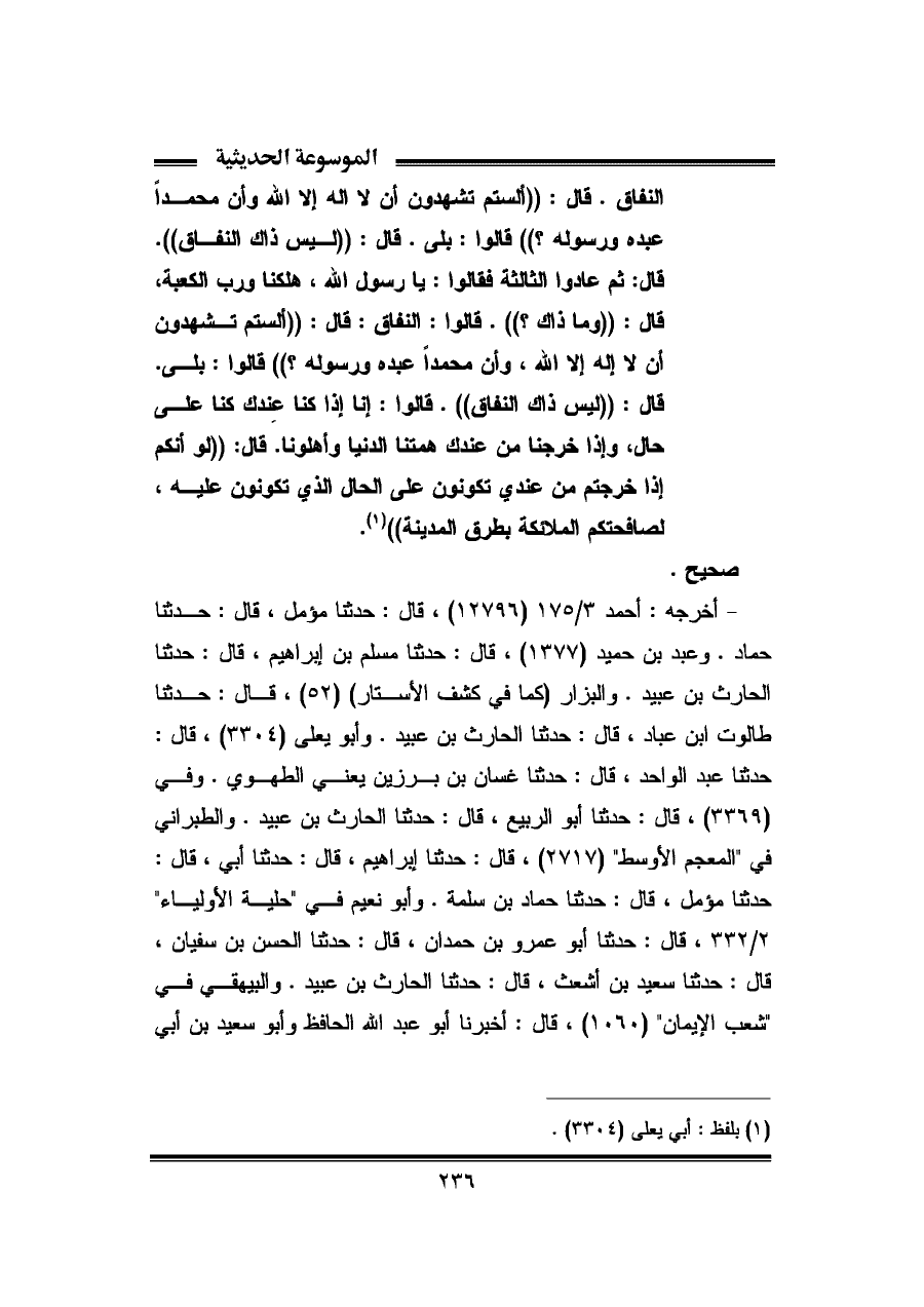 النفاق. قال: "ألستم تشهدون أن لا اله إلا الله وأن محمدًا عبده ورسوله؟ " قالوا: بلى. قال: "ليس ذاك النفاق". قال: ثم عادوا الثالثة فقالوا: يا رسول الله، هلكنا ورب الكعبة، قال: "وما ذاك؟ ". قالوا: النفاق: قال: "ألستم تشهدون أن لا إله إلا الله، وان محمدًا عبده ورسوله؟ " قالوا: بلى. قال: "ليس ذاك النفاق". قالوا: إنا إذا كنا عندك كنا على حال، وإذا خرجنا من عندك همتنا الدنيا وأهلونا. قال: "لو أنكم إذا خرجتم من عندي تكونون على الحال الذي تكونون عليه، لصافحتكم الملائكة بطرق المدينة" (¬١).