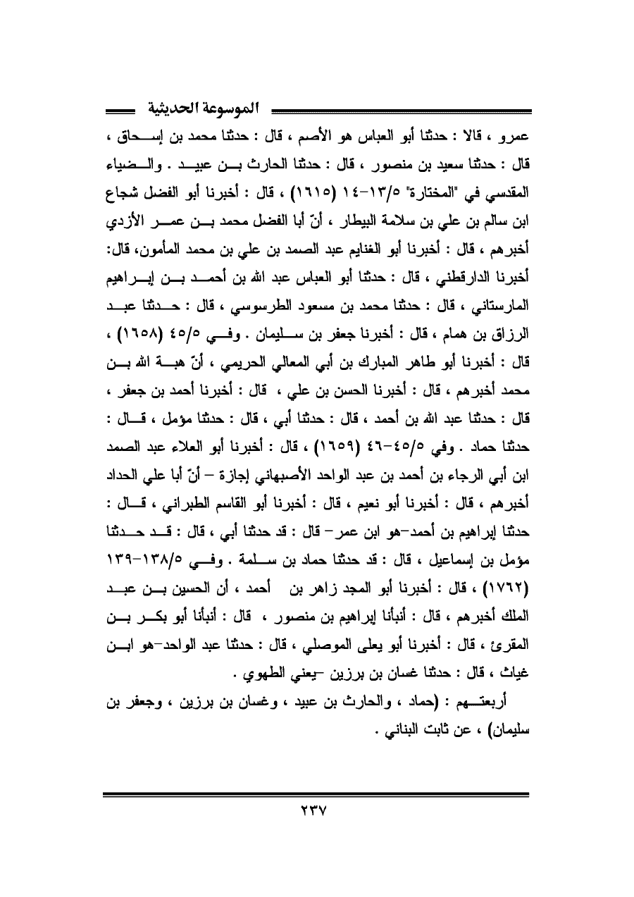 عمرو، قال: حدثنا أبو العباس هو الأصم، قال: حدثنا محمد بن إسحاق، قال: حدثنا سعيد بن منصور، قال: حدثنا الحارث بن عبيد. والضياء المقدسى في "المختارة" ٥/ ١٣ - ١٤ (١٦١٥)، قال: أخبرنا أبو الفضل شجاع بن سالم بن علي بن سلامة البيطار، أنّ أبا الفضل محمد بن عمر الأزدي أخبرهم، قال: أخبرنا أبو الغنايم عبد الصمد بن علي بن محمد المأمون، قال: أخبرنا الدارقطني، قال: حدثنا أبو العباس عبد الله بن أحمد بن إبراهيم المارستاني، قال: حدثنا محمد بن مسعود الطرسوسي، قال: حدثنا عبد الرزاق بن همام، قال: أخبرنا جعفر بن سليمان. وفي ٥/ ٤٥ (١٦٥٨)، قال: أخبرنا أبو طاهر المبارك بن أبي المعالي الحريمي، أنّ هبة الله بن محمد أخبرهم، قال: أخبرنا الحسن بن علي، قال: أخبرنا أحمد بن جعفر، قال: حدثنا عبد الله بن أحمد، قال: حدثنا أبي، قال: حدثنا مؤمل، قال: حدثنا حماد. وفي ٥/ ٤٥ - ٤٦ (١٦٥٩)، قال: أخبرنا أبو العلاء عبد الصمد بن أبي الرجاء بن أحمد بن عبد الواحد الأصبهاني إجازة - أنّ أبا علي الحداد أخبرهم، قال: أخبرنا أبو نعيم، قال: أخبرنا أبو القاسم الطبراني، قال: حدثنا إبراهيم بن أحمد - هو ابن عمر - قال: قد حدثنا أبي، قال: قد حدثنا مؤمل بن إسماعيل، قال: قد حدثنا حماد بن سلمة. وفي ٥/ ١٣٨ - ١٣٩ (١٧٦٢)، قال: أخبرنا أبو المجد زاهر بن أحمد، أن الحسين بن عبد الملك أخبرهم، قال: أنبأنا إبراهيم بن منصور، قال: أنبأنا أبو بكر بن المقرئ، قال: أخبرنا أبو يعلى الموصلي، قال: حدثنا عبد الواحد - هو ابن غياث، قال: حدثنا غسان بن برزين - يعني الطهوي.
