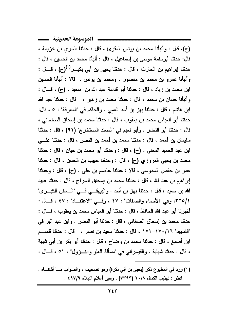 (ح)، قال: وأنبأنا محمد بن يونس المقرئ، قال: حدثنا السري بن خزيمة، قال: حدثنا أبو سلمة موسى بن إسماعيل، قال: أنبأنا محمد بن الحسين، قال: حدثنا إبراهيم بن الحارث، قال: حدثنا يحيى بن أبي بكير (¬١) (ح)، قال: وأنبأنا عمرو بن محمد بن منصور، ومحمد بن يونس، قال: أنبأنا الحسين بن محمد بن زياد، قال: حدثنا أبو قدامة عبد الله بن سعيد. (ح)، قال: وأنبأنا حسان بن محمد، قال: حدثنا محمد بن زهير، قال: حدثنا عبد الله بن هاشم، قال: حدثنا بهز بن أسد العمِي. والحاكم في "المعرفة": ٥، قال: حدثنا أبو العباس محمد بن يعقوب، قال: حدثنا محمد بن إسحاق الصنعاني، قال: حدثنا أبو النضر. وأبو نعيم في "المسند المستخرج" (٩١)، قال: حدثنا سليمان بن أحمد، قال: حدثنا محمد بن أحمد بن النضر، قال: حدثنا علي بن عبد الحميد المعنى. (ح)، قال: وحدلما أبو محمد بن حيان، قال: حدثنا محمد بن يحيى المروزي (ح)، قال: وحدثنا حبيب بن الحسن، قال: حدثنا عمر بن حفص السدوسي، قالا: حدثنا عاصم بن علي. (ح)، قال: وحدثنا إبراهيم بن عبد الله، قال: حدثنا محمد بن إسحاق السراج، قال: حدثنا عبيد الله بن سعيد، قال: حدثنا بهز بن أسد. والبيهقي في "السنن الكبرى" ٤/ ٣٢٥، وفي "الأسماء والصفات": ١٧، وفي "الاعتقاد": ٤٧، قال: أخبرنا أبو عبد الله الحافظ، قال: حدثنا أبو العباس محمد بن يعقوب، قال: حدثنا محمد بن إسحاق الصغاني، قال: حدثنا أبو النضر. وابن عبد البر في "التمهيد" ١٦/ ١٧٠ - ١٧١، قال: حدثنا سعيد بن نصر، قال: حدثنا قاسم بن أصبغ، قال: حدثنا محمد بن وضاح، قال: حدثنا أبو بكر بن أبي شيبة، قال: حدثنا شبابة. والقيسراني في "مسألة العلو والنزول": ٥١، قال: