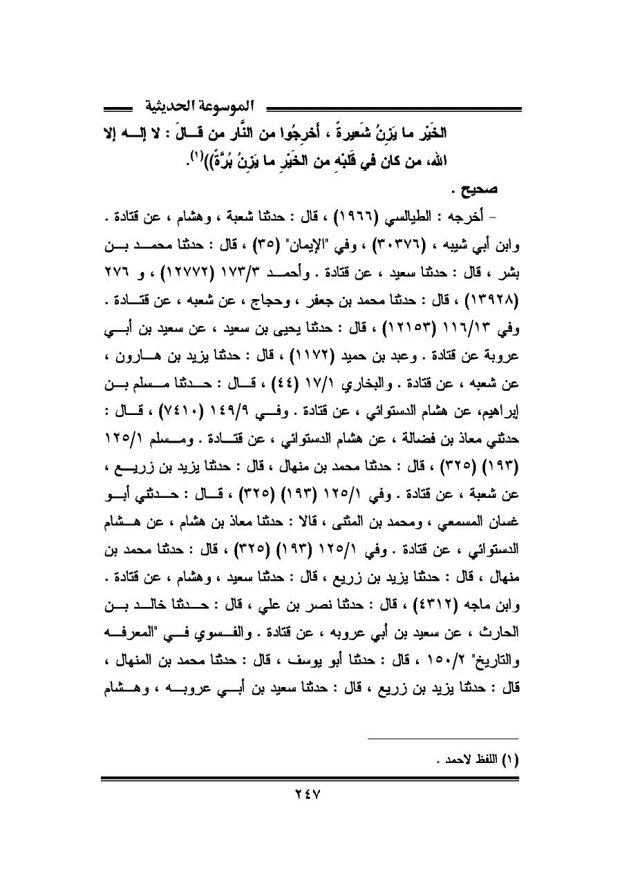 - أخرجه: الطيالسي (١٩٦٦)، قال: حدثنا شعبة، وهشام، عن قتادة. وابن أبي شيبة، (٣٠٣٧٦)، وفي "الإيمان" (٣٥)، قال: حدثنا محمد بن بشر، قال: حدثنا سعيد، عن قتادة. وأحمد ٣/ ١٧٣ (١٢٧٧٢)، و ٢٧٦ (١٣٩٢٨)، قال: حدثنا محمد بن جعفر، وحجاج، عن شعبه، عن قتادة. وفي ١٣/ ١١٦ (١٢١٥٣)، قال: حدثنا يحيى بن سعيد، عن سعيد بن أبي عروبة عن قتادة. وعبد بن حميد (١١٧٢)، قال: حدثنا يزيد بن هارون، عن شعبه، عن قتادة. والبخارى ١/ ١٧ (٤٤)، قال: حدثنا مسلم بن إبراهيم، عن هشام الدستوائي، عن قتادة. وفي ٩/ ١٤٩ (٧٤١٠)، قال: حدثني معاذ بن فضالة، عن هشام الدستوائي، عن قتادة. ومسلم ١/ ١٢٥ (١٩٣) (٣٢٥)، قال: حدثنا محمد بن منهال، قال: حدثنا يزيد بن زريع، عن شعبة، عن قتادة. وفي ١/ ١٢٥ (١٩٣) (٣٢٥)، قال: حدثني أبو غسان المسمعي، ومحمد بن المثنى، قال: حدثنا معاذ بن هشام، عن هشام الدستوائي، عن قتادة. وفي ١/ ١٢٥ (١٩٣) (٣٢٥)، قال: حدثنا محمد بن منهال، قال: حدثنا يزيد بن زريع، قال: حدثنا سعيد، وهشام، عن قتادة. وابن ماجه (٤٣١٢)، قال: حدثنا نصر بن علي، قال: حدثنا خالد بن الحارث، عن سعيد بن أبي عروبه، عن قتادة. والفسوي في "المعرفة والتاريخ" ٢/ ١٥٠، قال: حدثنا أبو يوسف، قال: حدثنا محمد بن المنهال، قال: حدثنا يزيد بن زريع، قال: حدثنا سعيد بن أبي عروبه، وهشام