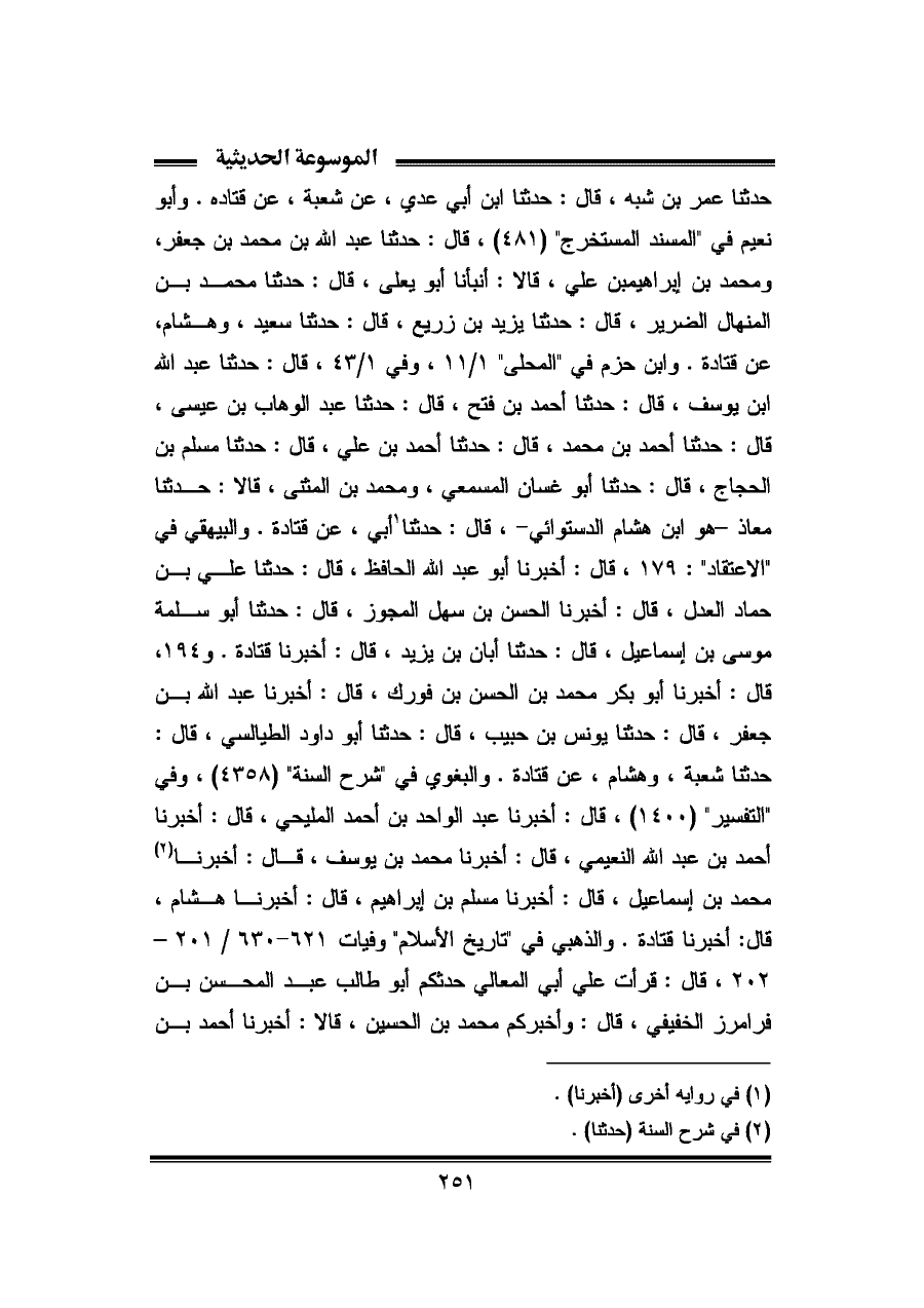 حدثنا عمر بن شبه، قال: حدثنا ابن أبي عدي، عن شعبة، عن قتاده. وأبو نعيم في "المسند المستخرج" (٤٨١)، قال: حدثنا عبد الله بن محمد بن جعفر، ومحمد بن إبراهيم بن علي، قال: أنبأنا أبو يعلى، قال: حدثنا محمد بن المنهال الضرير، قال: حدثنا يزيد بن زريع، قال: حدثنا سعيد، وهشام، عن قتادة. وابن حزم في "المحلى" ١/ ١١، وفي ١/ ٤٣، قال: حدثنا عبد الله بن يوسف، قال: حدثنا أحمد بن فتح، قال: حدثنا عبد الوهاب بن عيسى، قال: حدثنا أحمد بن محمد، قال: حدثنا أحمد بن علي، قال: حدثنا مسلم بن الحجاج، قال: حدثنا أبو غسان المسمعي، ومحمد بن المثنى، قال: حدثنا معاذ - هو ابن هشام الدستوائي -، قال: حدثنا (¬١) أبي، عن قتادة. والبيهقي في "الاعتقاد": ١٧٩، قال: أخبرنا أبو عبد الله الحافظ، قال: حدثنا علي بن حماد العدل، قال: أخبرنا الحسن بن سهل المجوز، قال: حدثنا أبو سلمة موسى بن إسماعيل، قال: حدثنا أبان بن يزيد، قال: أخبرنا قتادة. و ١٩٤، قال: أخبرنا أبو بكر محمد بن الحسن بن فورك، قال: أخبرنا عبد الله بن جعفر، قال: حدثنا يونس بن حبيب، قال: حدثنا أبو داود الطيالسي، قال: حدثنا شعبة، وهشام، عن قتادة. والبغوي في "شرح السنة" (٤٣٥٨)، وفي "التفسير" (١٤٠٠)، قال: أخبرنا عبد الواحد بن أحمد المليحي، قال: أخبرنا أحمد بن عبد الله النعيمي، قال: أخبرنا محمد بن يوسف، قال: أخبرنا (¬٢) محمد بن إسماعيل، قال: أخبرنا مسلم بن إبراهيم، قال: أخبرنا هشام، قال: أخبرنا قتادة. والذهبي في "تاريخ الإسلام" وفيات ٦٢١ - ٦٣٠/ ٢٠١ - ٢٠٢، قال: قرأت علي أبي المعالي حدثكم أبو طالب عبد المحسن بن فرامرز الخفيفي، قال: وأخبركم محمد بن الحسين، قال: أخبرنا أحمد بن