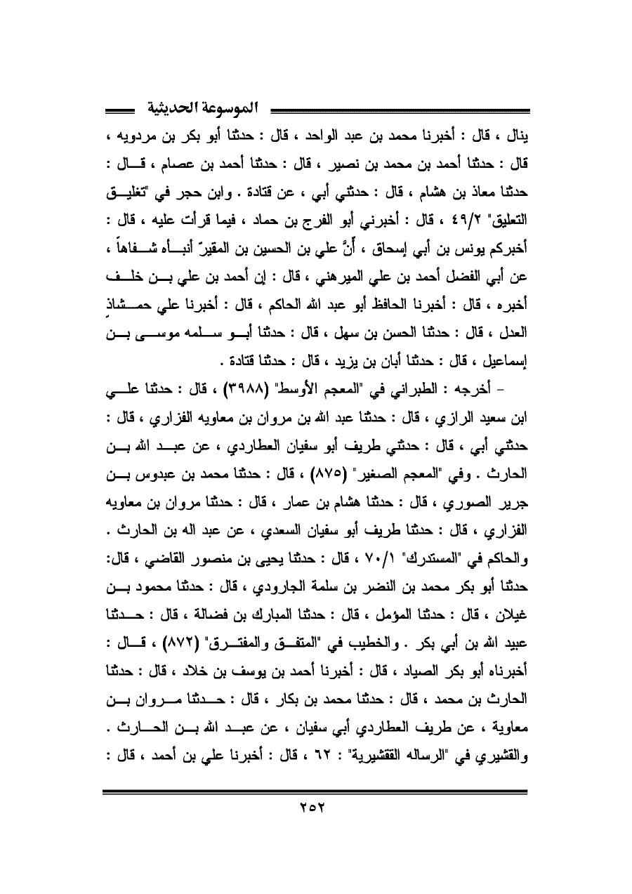 ينال، قال: أخبرنا محمد بن عبد الواحد، قال: حدثنا أبو بكر بن مردويه، قال: حدثنا أحمد بن محمد بن نصير، قال: حدثنا أحمد بن عصام، قال: حدثنا معاذ بن هشام، قال: حدثني أبي، عن قتادة. وابن حجر في "تغليق التعليق" ٢/ ٤٩، قال: أخبرني أبو الفرج بن حماد، فيما قرأت عليه، قال: أخبركم يونس بن أبي إسحاق، أَنَّ علي بن الحسين بن المقيّر أنبأه شفاهًا، عن أبي الفضل أحمد بن علي الميرهني، قال: ان أحمد بن علي بن خلف أخبره، قال: أخبرنا الحافظ أبو عبد الله الحاكم، قال: أخبرنا علي حمشاذٍ العدل، قال: حدثنا الحسن بن سهل، قال: حدثنا أبو سلمه موسى بن إسماعيل، قال: حدثنا أبان بن يزيد، قال: حدثنا قتادة.