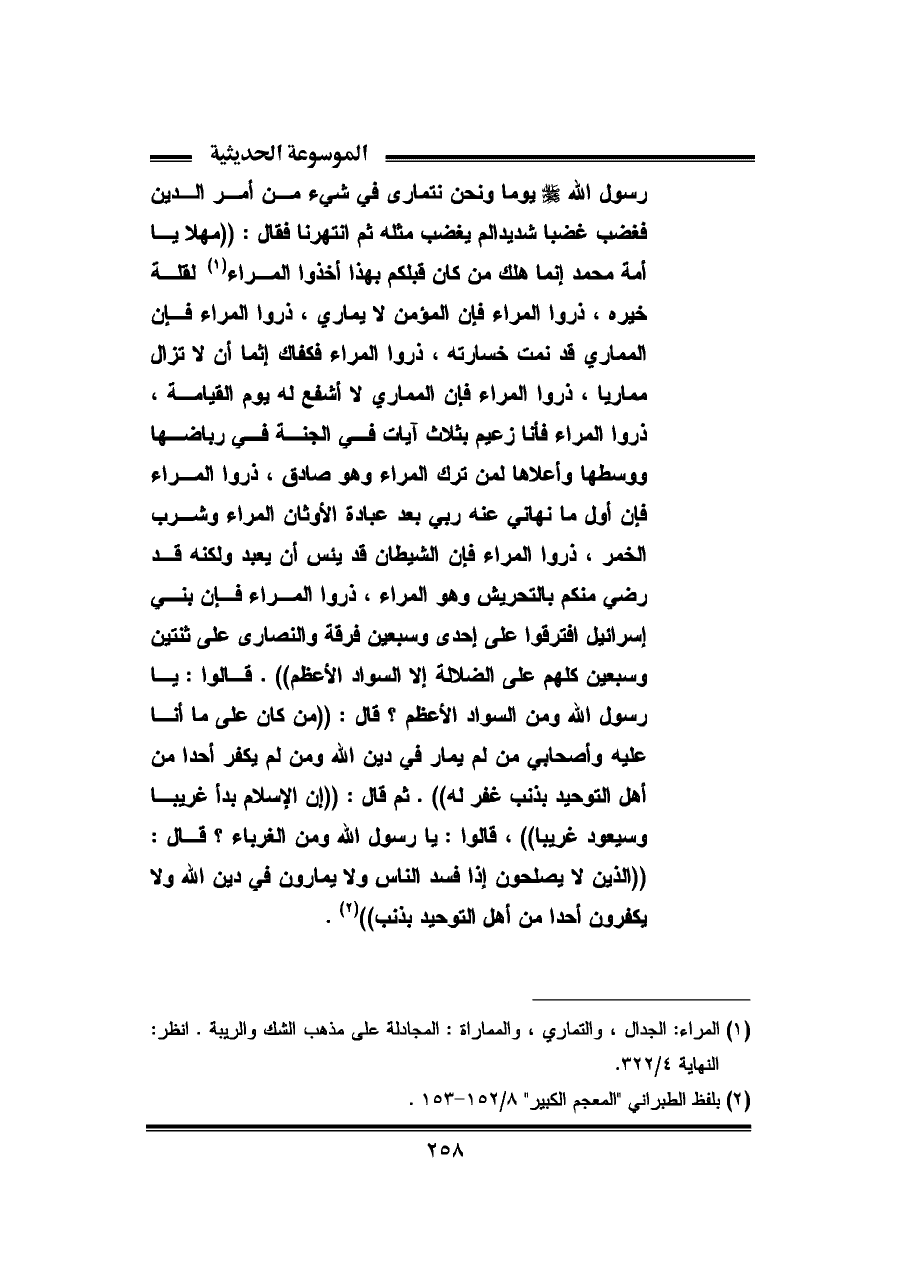 (¬١) المراء: الجدال، والتماري، والمماراة: المجادلة على مذهب الشك والريبة. انظر: النهاية ٤/ ٣٢٢.