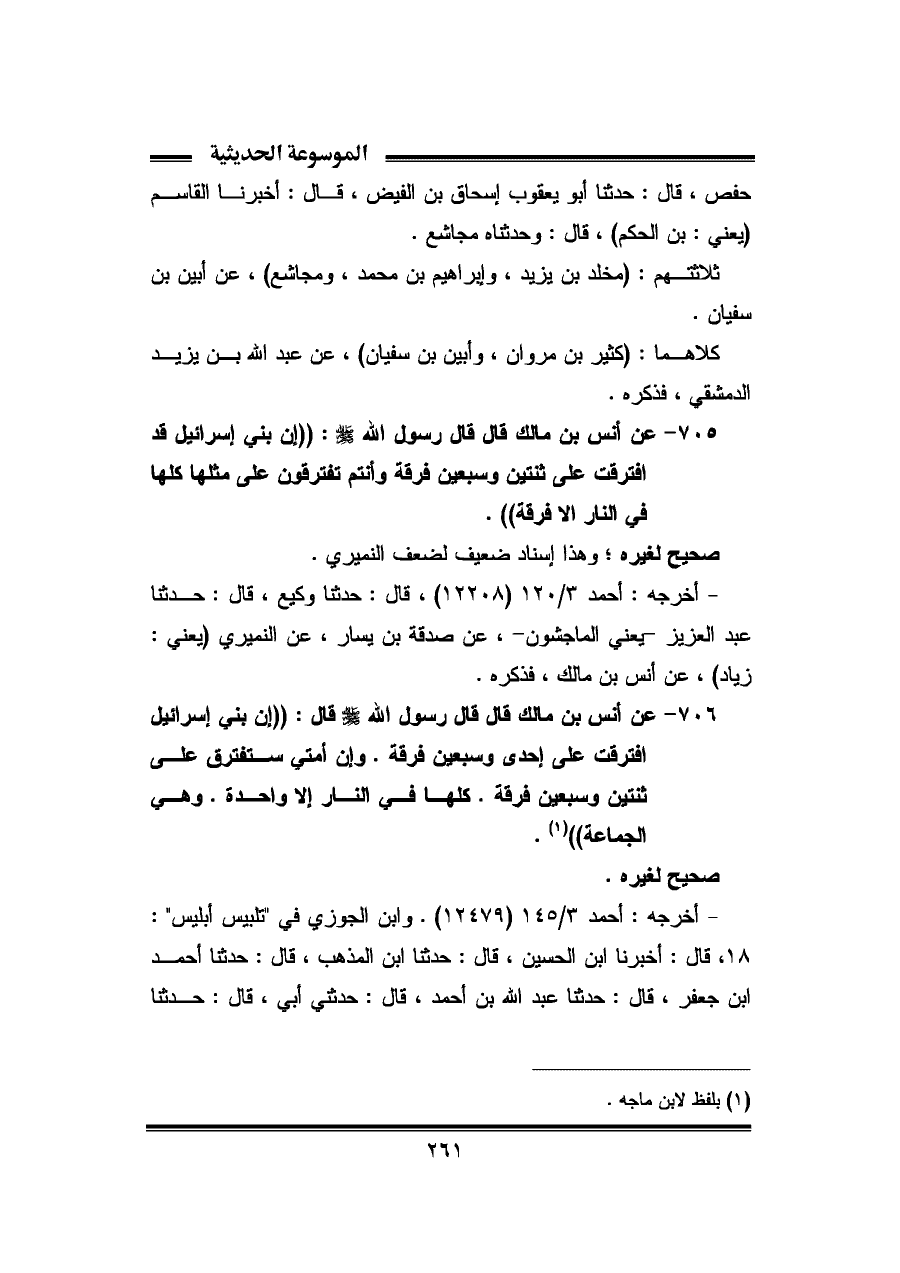٧٠٥ - عن أنس بن ملك قال قال رسول الله - صلى الله عليه وسلم -: "إن بني إسرائيل قد افترقت على ثنتين وسبعين فرقة وأنتم تفترقون على مثلها كلها في النار إلا فرقة".