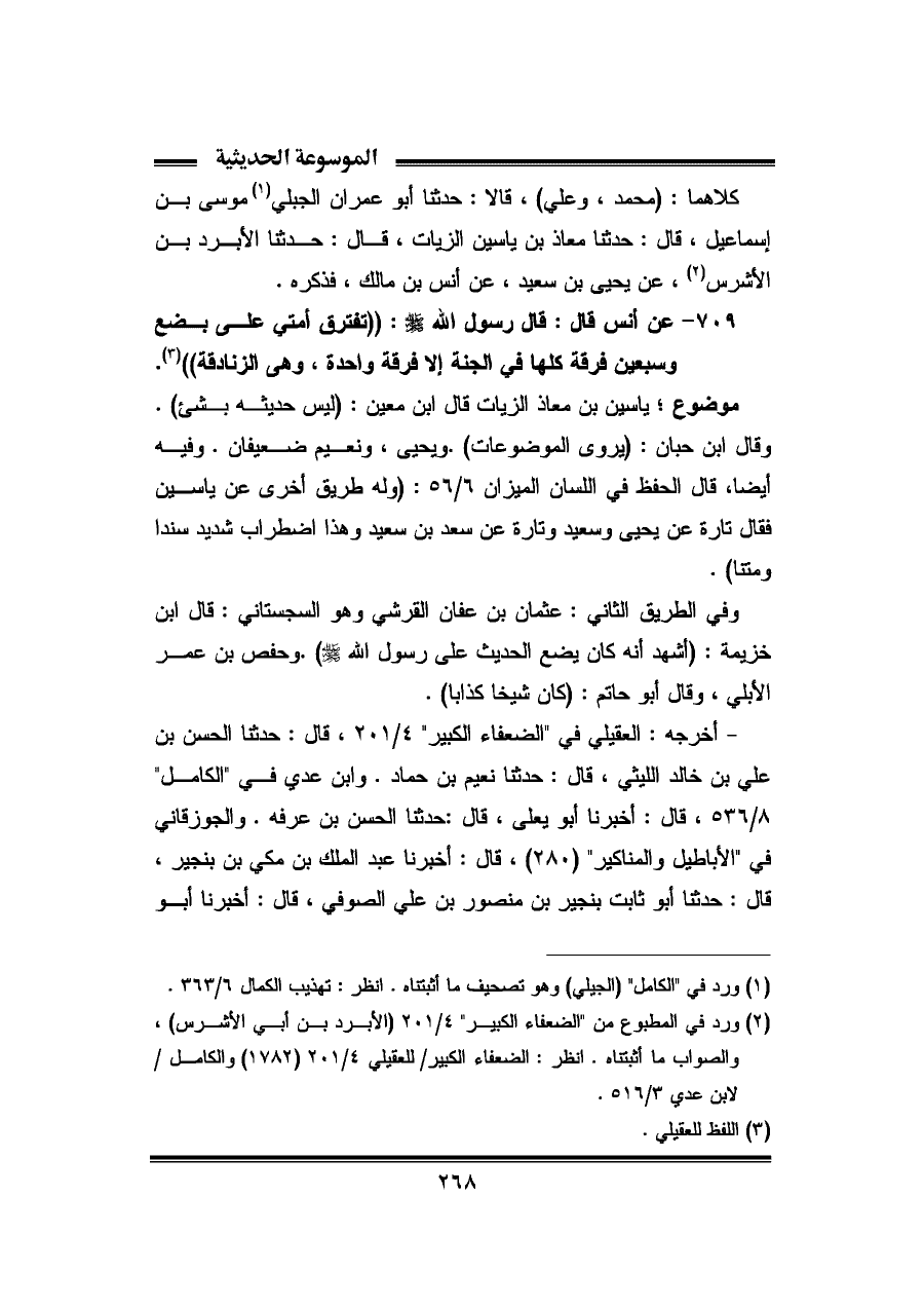 ٧٠٩ - عن أنس قال: قال رسول الله - صلى الله عليه وسلم -: "تفترق أمتي على بضع وسبعين فرقة كلها في الجنة إلا فرقة واحدة، وهى الزنادقة" (¬٣).