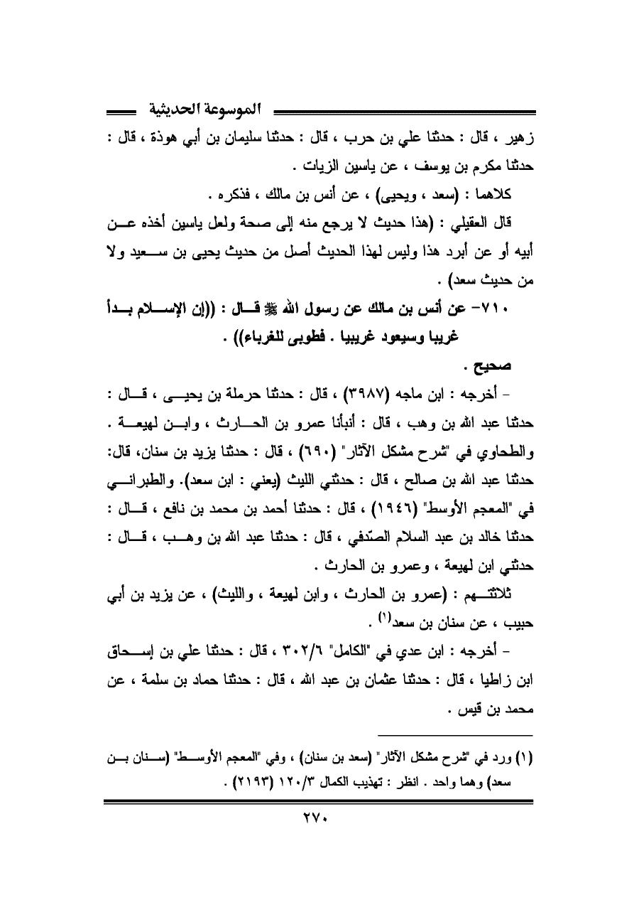 ٧١٠ - عن أنس بن مالك عن رسول الله - صلى الله عليه وسلم - قال: "إن الإسلام بدأ غريبا وسيعود غريبا. فطوبى للغرباء".