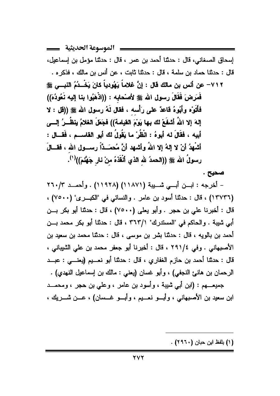 ٧١٢ - عن أنس بن مالك قال: إنَّ غلاما يهُوديًا كانَ يخدُمُ النبي - صلى الله عليه وسلم - فَمَرضَ فَقَالَ رسول الله - صلى الله عليه وسلم - لأصْحابِه: "اذْهَبُوا بنا إليه نَعُودُه" فأَتَوْه وأَبُوهُ قاعدٌ على رَأسِهِ، فقال لَهُ رسول الله - صلى الله عليه وسلم - "قل: لا إلهَ إلا اللهُ أشفَعْ لك بها يوْمَ القيامة " فجَعلَ الغلامُ ينظُرُ إلى أبيه، فقَالَ له أبوهُ: انْظُرْ ما يَقُولُ لك أبو القاسم، فَقال: أشْهدُ أنْ لا إلهُ إلا اللّهُ وأشهد أنَّ مُحمَدًّا رسول الله، فقالَ رسولُ الله - صلى الله عليه وسلم - "الحمدُ للهِ الذي أنْقَذهُ مِنْ نارِ جَهَّنمَ" (¬١).