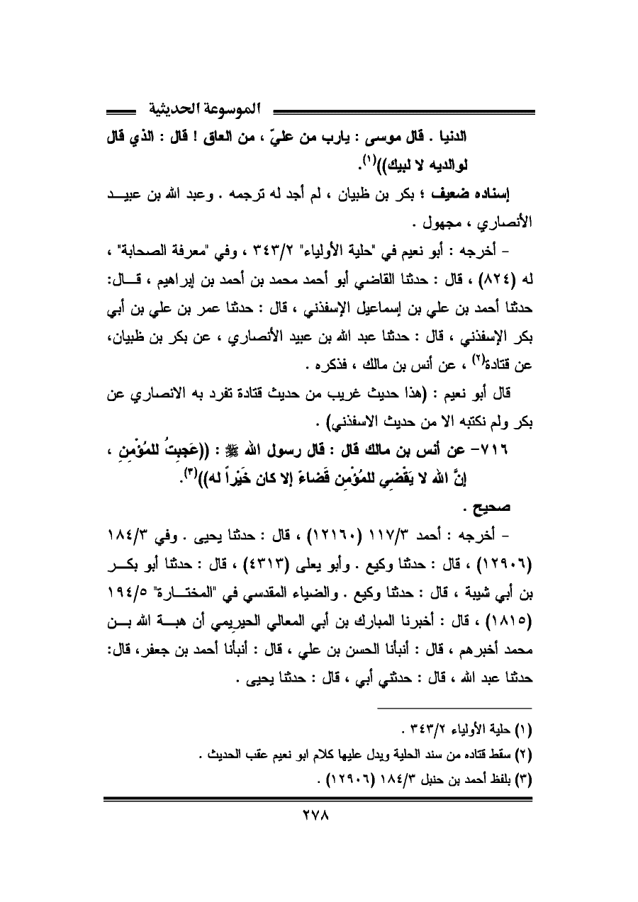 ٧١٦ - عن أنس بن مالك قال: قال رسول الله - صلى الله عليه وسلم -: "عَجبِتُ للمُؤْمِنِ، إن الله لا يَقْضِي للمُؤْمِن قَضاءً إلا كان خَيْرًا له" (¬٣).