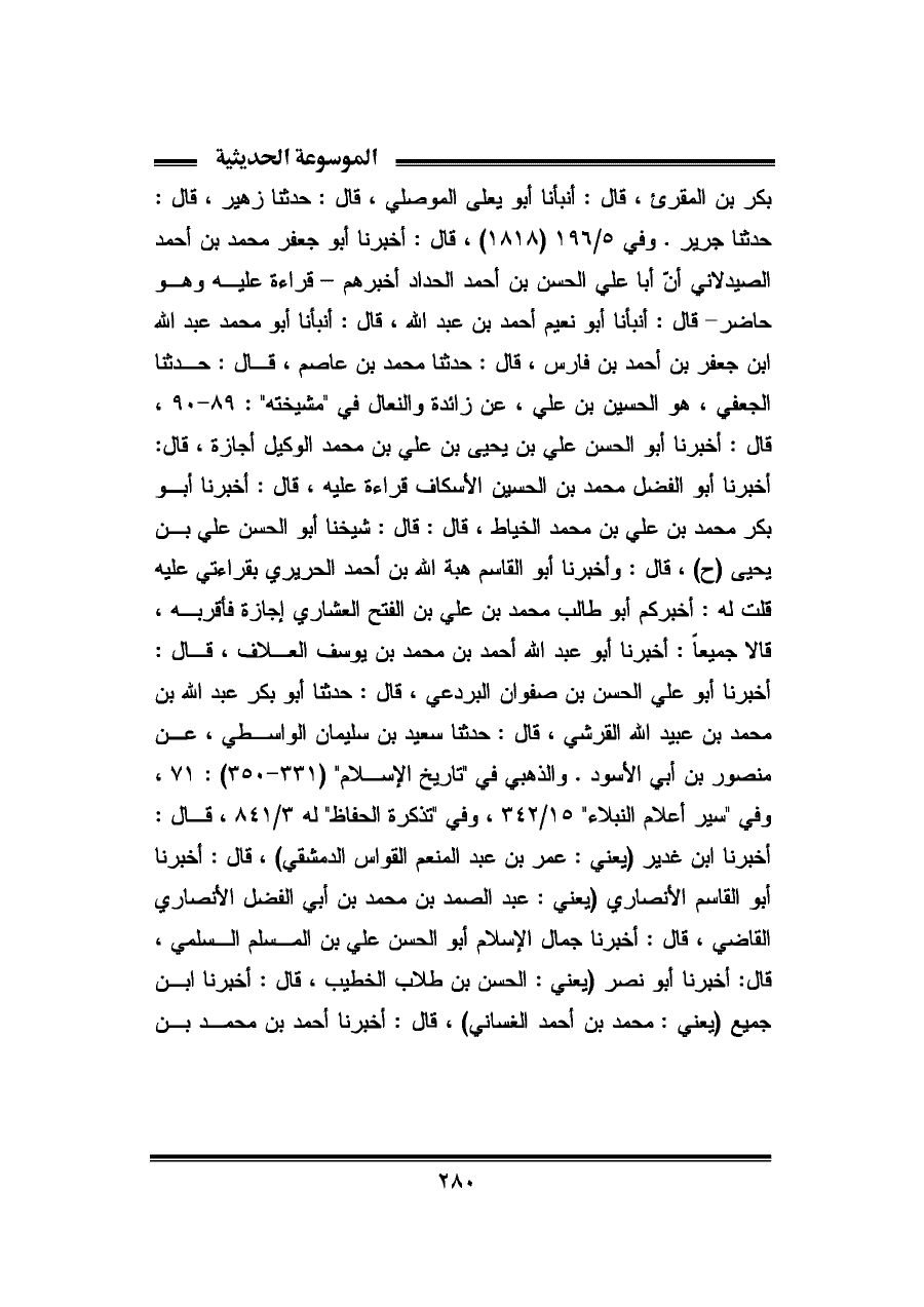 بكر بن المقرئ، قال: أنبأنا أبو يعلى الموصلي، قال: حدثنا زهير، قال: حدثنا جرير. وفي ٥/ ١٩٦ (١٨١٨)، قال: أخبرنا أبو جعفر محمد بن أحمد الصيدلاني أنّ أبا علي الحسن بن أحمد الحداد أخبرهم - قراءة عليه وهو حاضر - قال: أنبأنا أبو نعيم أحمد بن عبد الله، قال: أنبأنا أبو محمد عبد الله بن جعفر بن أحمد بن فارس، قال: حدثنا محمد بن عاصم، قال: حدثنا الجعفي، هو الحسين بن علي، عن زائدة والنعال في "مشيخته": ٨٩ - ٩٠، قال: أخبرنا أبو الحسن علي بن يحيى بن علي بن محمد الوكيل أجازة، قال: أخبرنا أبو الفضل محمد بن الحسين الأسكاف قراءة عليه، قال: أخبرنا أبو بكر محمد بن علي بن محمد الخياط، قال: قال: شيخنا أبو الحسن علي بن يحيى (ح)، قال: وأخبرنا أبو القاسم هبة الله بن أحمد الحريري بقراءتي عليه قلت له: أخبركم أبو طالب محمد بن علي بن الفتح العشاري إجازة فأقربه، قالا جميعًا: أخبرنا أبو عبد الله أحمد بن محمد بن يوسف العلاف، قال: أخبرنا أبو علي الحسن بن صفوان البردعي، قال: حدثنا أبو بكر عبد الله بن محمد بن عبيد الله القرشي، قال: حدثنا سعيد بن سليمان الواسطي، عن منصور بن أبي الأسود. والذهبي في "تاريخ الإسلام" (٣٣١ - ٣٥٠): ٧١، وفي "سير أعلام النبلاء" ١٥/ ٣٤٢، وفي "تذكرة الحفاظ" له ٣/ ٨٤١، قال: أخبرنا ابن غدير (يعني: عمر بن عبد المنعم القواس الدمشقي)، قال: أخبرنا أبو القاسم الأنصاري (يعني: عبد الصمد بن محمد بن أبي الفضل الأنصاري القاضي، قال: أخبرنا جمال الإسلام أبو الحسن علي بن المسلم السلمي، قال: أخبرنا أبو نصر (يعني: الحسن بن طلاب الخطيب، قال: أخبرنا ابن جميع (يعني: محمد بن أحمد الغساني)، قال: أخبرنا أحمد بن محمد بن