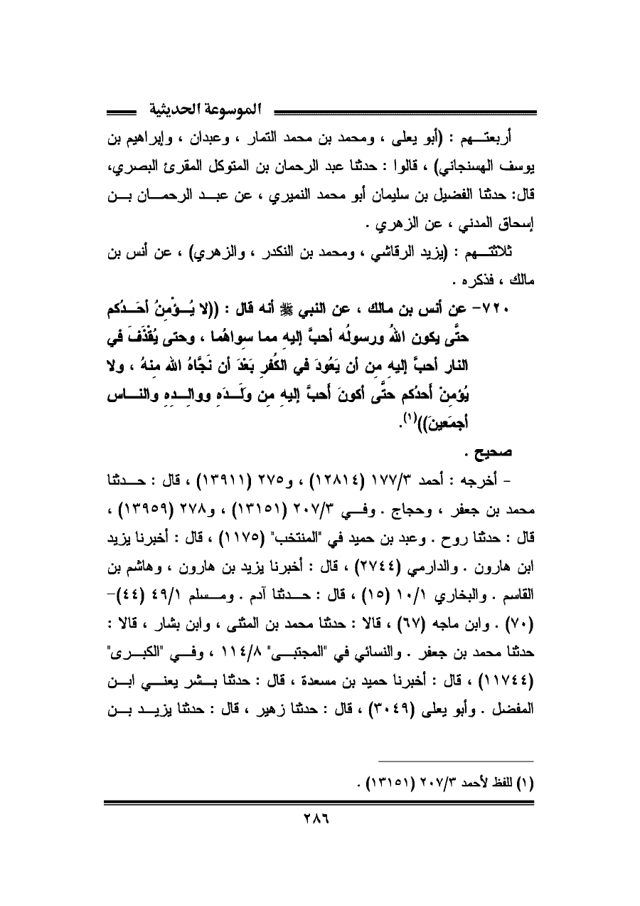 ٧٢٠ - عن أنس بن مالك، عن النبي - صلى الله عليه وسلم - أنه قال: "لا يؤْمِنُ أحَدُكم حتَّى يكون اللهُ ورسولُه أحبَّ إليهِ مما سِواهُما، وحتى يقْذَفَ في النار أحبَّ إليهِ مِن أن يَعُودَ في الكُفرِ بَعْدَ أن نَجَّاهُ الله مِنهُ، ولا يؤمِنْ أَحدُكم حتَّى أكونَ أحبَّ إليهِ مِن ولَدَهِ وولِدِهِ والناس أجمَعينَ" (¬١).