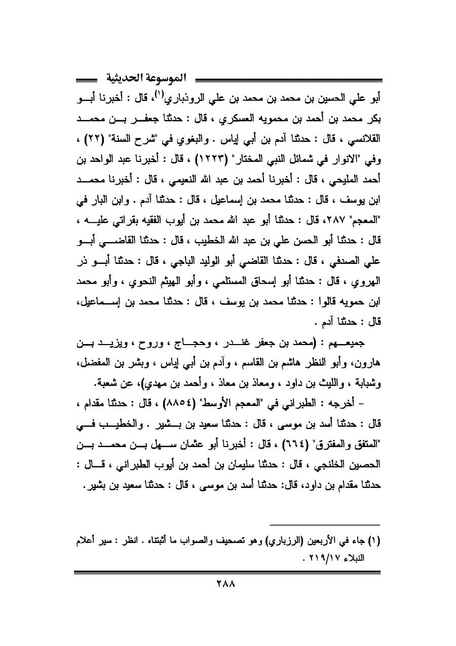 أبو علي الحسين بن محمد بن محمد بن علي الروذباري (¬١)، قال: أخبرنا أبو بكر محمد بن أحمد بن محمويه العسكري، قال: حدثنا جعفر بن محمد القلانسي، قال: حدثنا آدم بن أبي إياس. والبغوي في "شرح السنة" (٢٢)، وفي "الأنوار في شمائل النبي المختار" (١٢٢٣)، قال: أخبرنا عبد الواحد بن أحمد المليحي، قال: أخبرنا أحمد بن عبد الله النعيمي، قال: أخبرنا محمد بن يوسف، قال: حدثنا محمد بن إسماعيل، قال: حدثنا آدم. وابن البار في "المعجم" ٢٨٧، قال: حدثنا أبو عبد الله محمد بن أيوب الفقيه بقراتي عليه، قال: حدثنا أبو الحسن علي بن عبد الله الخطيب، قال: حدثنا القاضي أبو علي الصدفي، قال: حدثنا القاضي أبو الوليد الباجي، قال: حدثنا أبو ذر الهروي، قال: حدثنا أبو إسحاق المستلمي، وأبو الهيثم النحوي، وأبو محمد بن حمويه قالوا: حدثنا محمد بن يوسف، قال: حدثنا محمد بن إسماعيل، قال: حدثنا آدم.