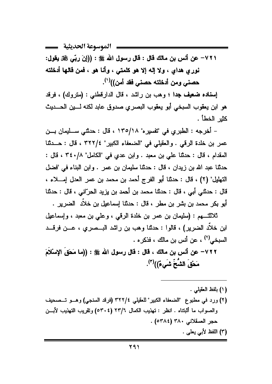 ٧٢١ - عن أنس بن مالك قال: قال رسول الله - صلى الله عليه وسلم -: "إنَّ ربّي - عز وجل - يقول: نوري هداي، ولا إلا إلا هو كلمتي، وأنا هو، فمن قالها أدخلته حصني ومن أدخلته حصنى فقد أمن" (¬١).