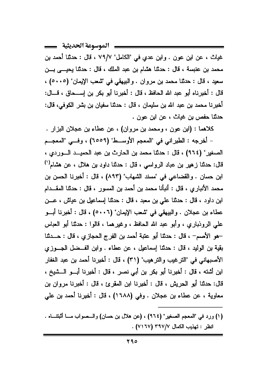 غياث، عن ابن عون. وابن عدي في "الكامل" ٧/ ٧٩، قال: حدثنا أحمد بن محمد بن عنبسة، قال: حدثنا هشام بن عبد الملك، قال: حدثنا يحيى بن سعيد، قال: حدثنا محمد بن مروان. والبيهقي في "شعب الإيمان" (٥٠٠٥)، قال: أخبرناه أبو عبد الله الحافظ، قال: أخبرنا أبو بكر بن إسحاق، قال: أخبرنا محمد بن عبد الله بن سليمان، قال: حدثنا سفيان بن بشر الكوفي، قال: حدثنا حفص بن غياث، عن ابن عون.