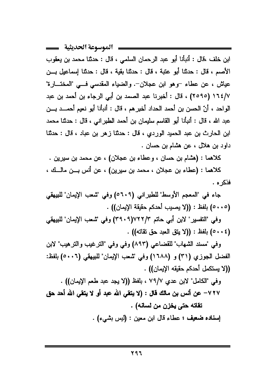 ابن خلف، قال: أنبأنا أبو عبد الرحمان السلمي، قال: حدثنا محمد بن يعقوب الأصم، قال: حدثنا أبو عتبة، قال: حدثنا بقية، قال: حدثنا إسماعيل بن عياش، عن عطاء - وهو ابن عجلان -. والضياء المقدسي في "المختارة" ٧/ ١٦٤ (٢٥٩٥)، قال: أخبرنا عبد الصمد بن أبي الرجاء بن أحمد بن عبد الواحد، أنّ الحسن بن أحمد الحداد أخبرهم، قال: أنبأنا أبو نعيم أحمد بن عبد الله، قال: أنبأنا أبو القاسم سليمان بن أحمد الطبراني، قال: حدثنا محمد بن الحارث بن عبد الحميد الوردي، قال: حدثنا زهر بن عباد، قال: حدثنا داود بن هلال، عن هشام بن حسان.