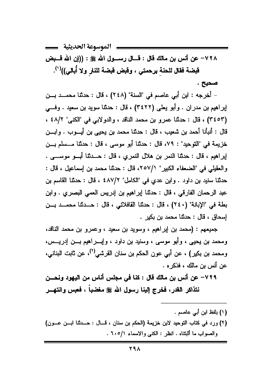 ٧٢٩ - عن أنس بن مالك قال: كنا في مجلس أناس من اليهود ونحن نتذاكر القدر، فخرج إلينا رسول الله - صلى الله عليه وسلم - مغضبًا، فعبس وانتهر