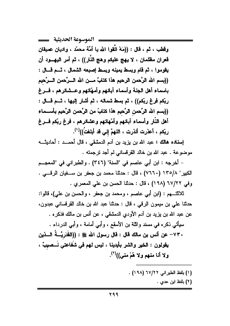 ٧٣٠ - عن أنس بن مالك قال: قال رسول الله - صلى الله عليه وسلم -: "القَدَرِيَّةُ الذين يقولون: الخير والشر بأيدينا، ليس لهم في شَفاعتي نَصيِبٌ، ولا أنا منهم ولا هُمْ منى" (¬٢).