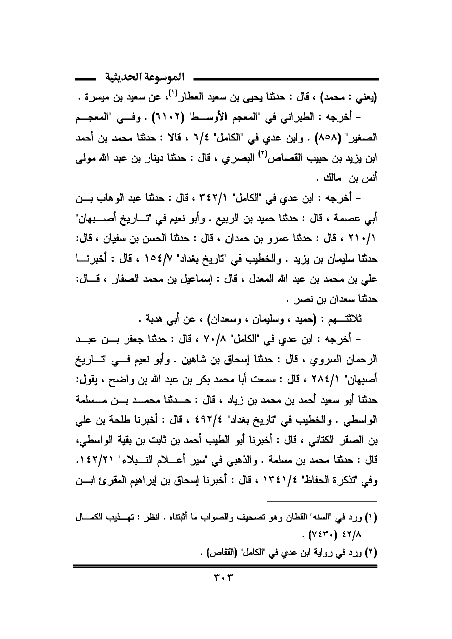- أخرجه: ابن عدي في "الكامل" ١/ ٣٤٢، قال: حدثنا عبد الوهاب بن أبي عصمة، قال: حدثنا حميد بن الربيع. وأبو نعيم في " تاريخ أصبهان" ١/ ٢١٠، قال: حدثنا عمرو بن حمدان، قال: حدثنا الحسن بن سفيان، قال: حدثنا سليمان بن يزيد. والخطيب في "تاريخ بغداد" ٧/ ١٥٤، قال: أخبرنا علي بن محمد بن عبد الله المعدل، قال: إسماعيل بن محمد الصفار، قال: حدثنا سعدان بن نصر.