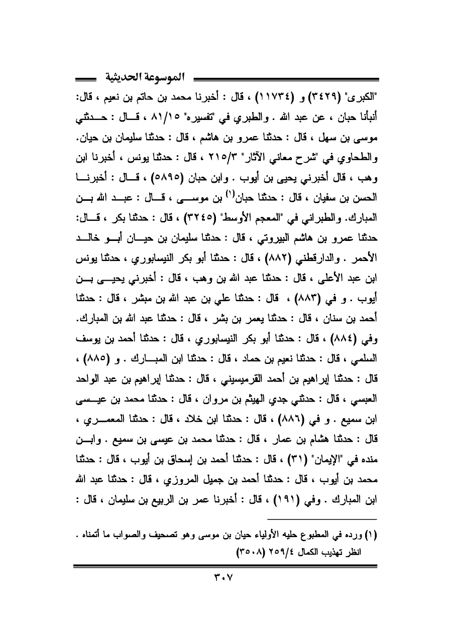 "الكبرى" (٣٤٢٩) و (١١٧٣٤)، قال: أخبرنا محمد بن حاتم بن نعيم، قال: أنبأنا حبان، عن عبد الله. والطبري في "تفسيره" ١٥/ ٨١، قال: حدثني موسى بن سهل، قال: حدثنا عمرو بن هاشم، قال: حدثنا سليمان بن حيان. والطحاوي في "شرح معاني الآثار" ٣/ ٢١٥، قال: حدثنا يونس، أخبرنا ابن وهب، قال أخبرني يحيى بن أيوب. وابن حبان (٥٨٩٥)، قال: أخبرنا الحسن بن سفيان، قال: حدثنا حبان (¬١) بن موسى، قال: عبد الله بن المبارك. والطبراني في "المعجم الأوسط" (٣٢٤٥)، قال: حدثنا بكر، قال: حدثنا عمرو بن هاشم البيروتي، قال: حدثنا سليمان بن حيان أبو خالد الأحمر. والدارقطني (٨٨٢)، قال: حدثنا أبو بكر النيسابوري، حدثنا يونس بن عبد الأعلى، قال: حدثنا عبد الله بن وهب، قال: أخبرني يحيى بن أيوب. وفي (٨٨٣)، قال: حدثنا علي بن عبد الله بن مبشر، قال: حدثنا أحمد بن سنان، قال: حدثنا يعمر بن بشر، قال: حدثنا عبد الله بن المبارك. وفي (٨٨٤)، قال: حدثنا أبو بكر النيسابوري، قال: حدثنا أحمد بن يوسف السلمي، قال: حدثنا نعيم بن حماد، قال: حدثنا ابن المبارك. و (٨٨٥)، قال: حدثنا إبراهيم بن أحمد القرميسيني، قال: حدثنا إبراهيم بن عبد الواحد العبسي، قال: حدثني جدي الهيثم بن مروان، قال: حدثنا محمد بن عيسى بن سميع. وفي (٨٨٦)، قال: حدثنا ابن خلاد، قال: حدثنا المعمري، قال: حدثنا هشام بن عمار، قال: حدثنا محمد بن عيسى بن سميع. وابن منده في "الإيمان" (٣١)، قال: حدثنا أحمد بن إسحاق بن أيوب، قال: حدثنا محمد بن أيوب، قال: حدثنا أحمد بن جميل المروزي، قال: حدثنا عبد الله بن المبارك. وفي (١٩١)، قال: أخبرنا عمر بن الربيع بن سليمان، قال: