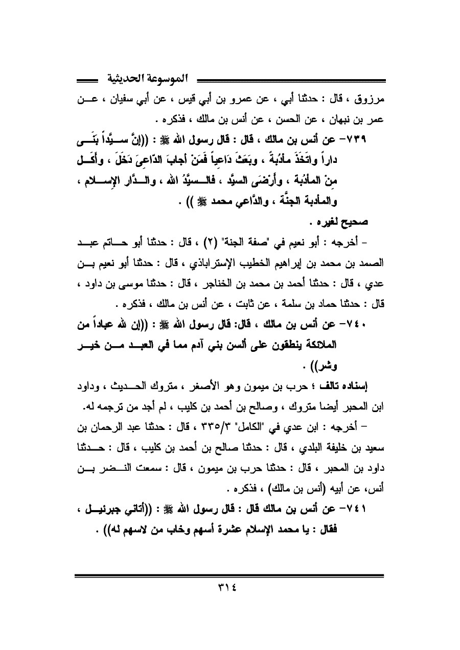 ٧٣٩ - عن أنس بن مالك، قال: قال رسول الله - صلى الله عليه وسلم -: "إنَّ سيِّدًا بنَى دارًا واتَّخَذَ مأدُبًة، وبَعَثَ دَاعِيًا فَمَن أجابَ الدّاعِىَ دَخَلَ، وأَكَل مِنْ المأدُبة، وأرْضَى السيِّد، فالسيِّدُ الله، والدَّار الإِسلام، والمأدبة الجنَّة، والدَّاعي محمد - صلى الله عليه وسلم -".