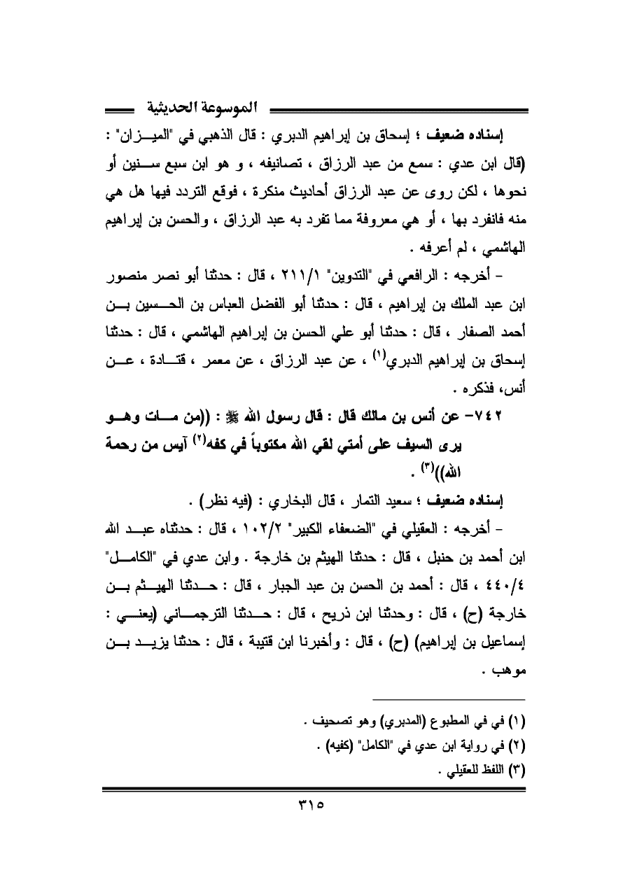 - أخرجه: الرافعي في "التدوين" ١/ ٢١١، قال: حدثنا أبو نصر منصور بن عبد الملك بن إبراهيم، قال: حدثنا أبو الفضل العباس بن الحسين بن أحمد الصفار، قال: حدثنا أبو علي الحسن بن إبراهيم الهاشمي، قال: حدثنا إسحاق بن إبراهيم الدبري (¬١)، عن عبد الرزاق، عن معمر، قتادة، عن أنس، فذكره.