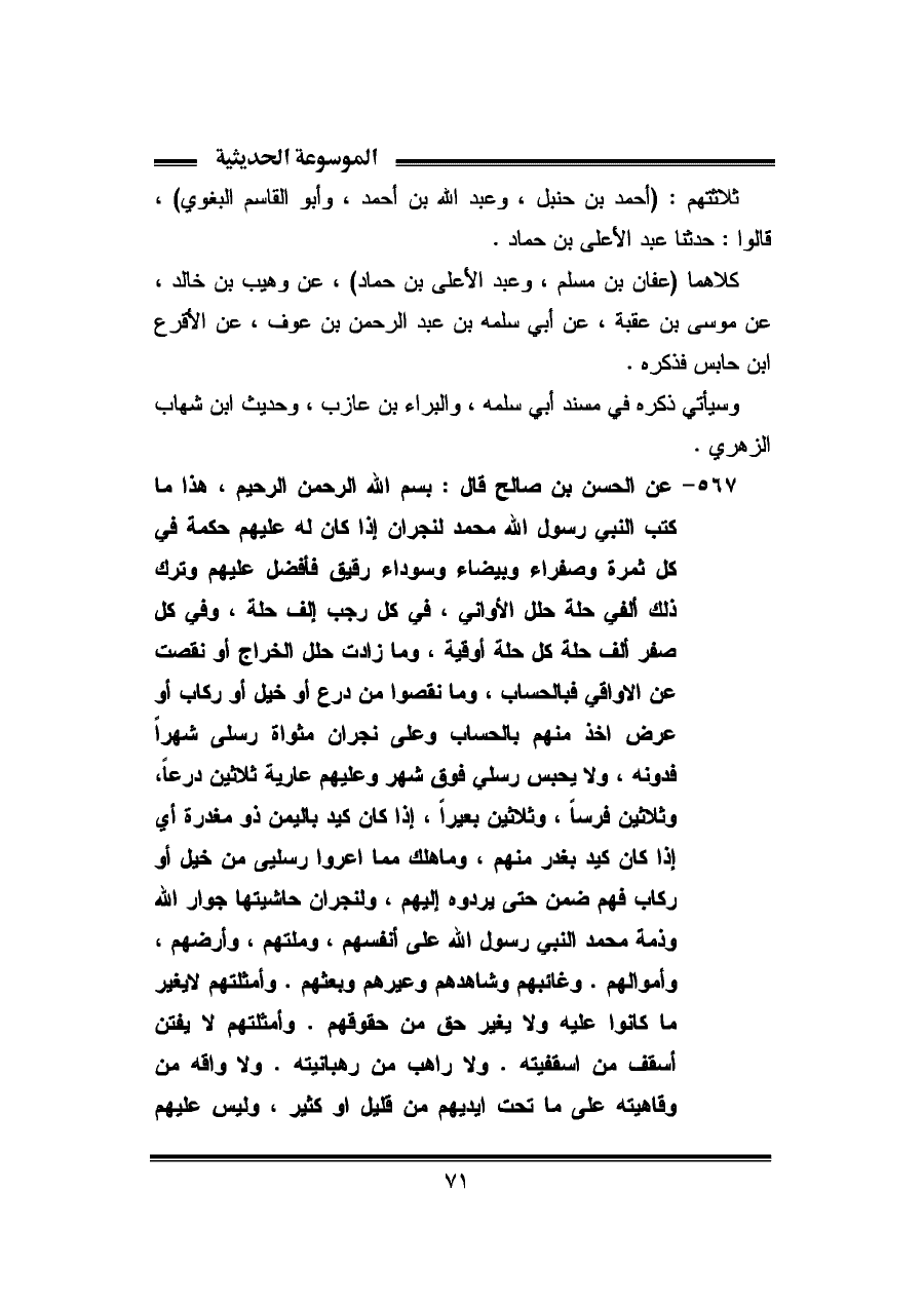 ٥٦٧ - عن الحسن بن صالح قال: بسم الله الرحمن الرحيم، هذا ما كتب النبي رسول الله محمد لنجران إذا كان له عليهم حكمة في كل ثمرة وصفراء وبيضاء وسوداء رقيق فأفضل عليهم وترك ذلك ألفي حلة حلل الأوانى، في كل رجب إلف حلة، وفي كل صفر ألف حلة كل حلة أوقية، وما زادت حلل الخراج أو نقصت عن الأواقى فبالحساب، وما نقصوا من درع أو خيل أو ركاب أو عرض اخذ منهم بالحساب وعلى نجران مثواة رسلى شهراً فدونه، ولا يحبس رسلى فوق شهر وعليهم عارية ثلاثين درعاً، وثلاثين فرساً، وثلاثين بعيراً، إذا كان كيد باليمن ذو مغدرة اي إذا كان كيد بغدر منهم، وما هلك مما أعروا رسليى من خيل أو ركاب فهم ضمن حتى يردوه إليهم، ولنجران حاشيتها جوار الله وذمة محمد النبي رسول الله على أنفسهم، وملتهم، وأرضهم، وأموالهم. وغائبهم وشاهدهم وعيرهم وبعثهم. وأمثلتهم لا يغير ما كانوا عليه ولا يغير حق من حقوقهم. وأمثلتهم لا يفتن أسقف من اسقفيته. ولا راهب من رهبانيته. ولا واقه من وقاهيته على ما تحت أيديهم من قليل أو كثير، وليس عليهم