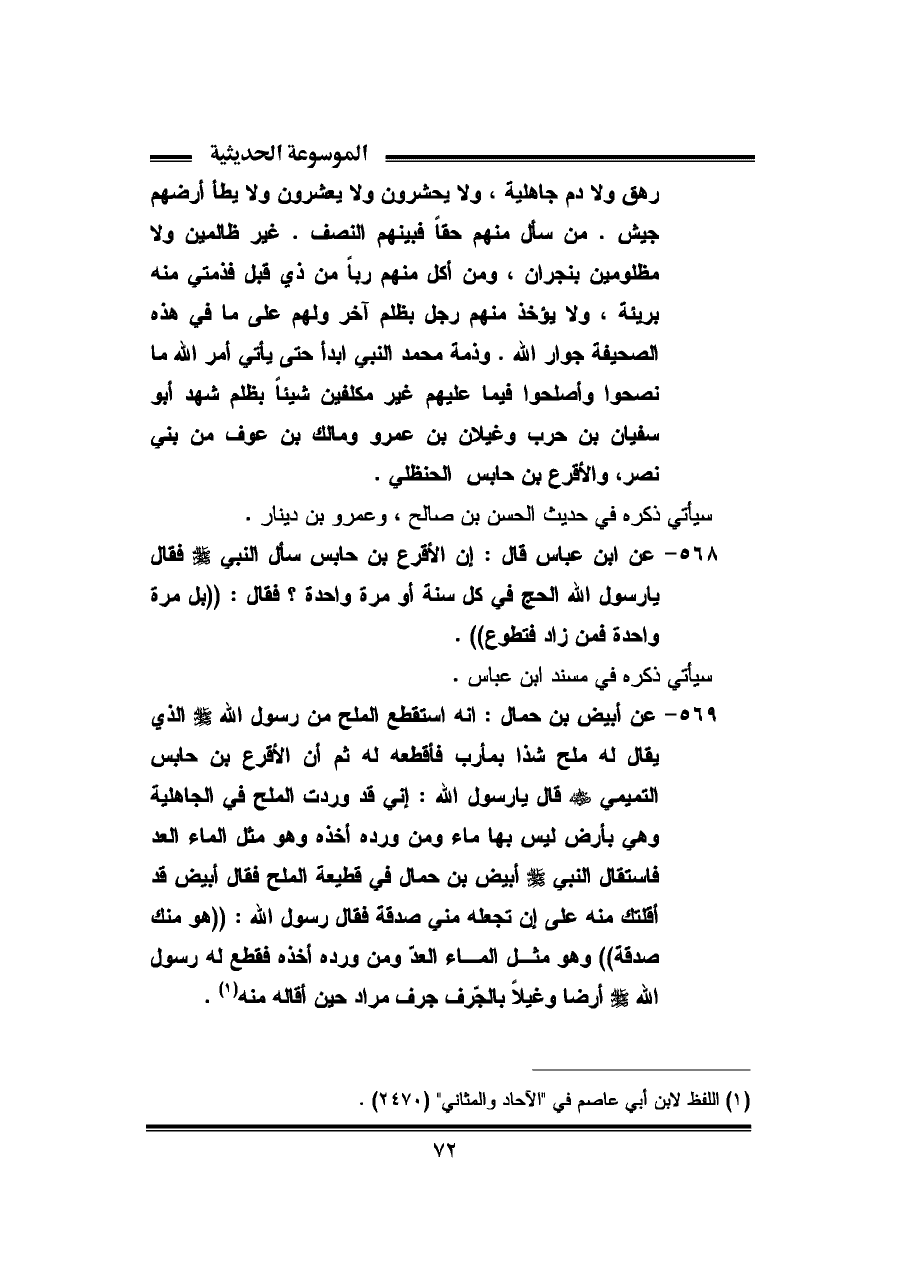 ٥٦٩ - عن أبيض بن حمال: أنه استقطع الملح من رسول الله - صلى الله عليه وسلم - الذي يقال له ملح شذا بمأرب فأقطعه له ثم أن الأقرع بن حابس التميمى - رضي الله عنه - قال يا رسول الله: إنى قد وردت الملح فى الجاهلية وهى بأرض ليس بها ماء ومن ورده أخذه وهو مثل الماء العد فاستقال النبي - صلى الله عليه وسلم - أبيض بن حمال في قطيعة الملح فقال أبيض قد أقلتك منه على أن تجعله مني صدقة فقال رسول الله: "هو منك صدقه" وهو مثل الماء العدّ ومن ورده أخذه فقطع له رسول الله - صلى الله عليه وسلم - أرضا وغيلاً بالجّرف جرف مراد حين أقاله منه (¬١).
