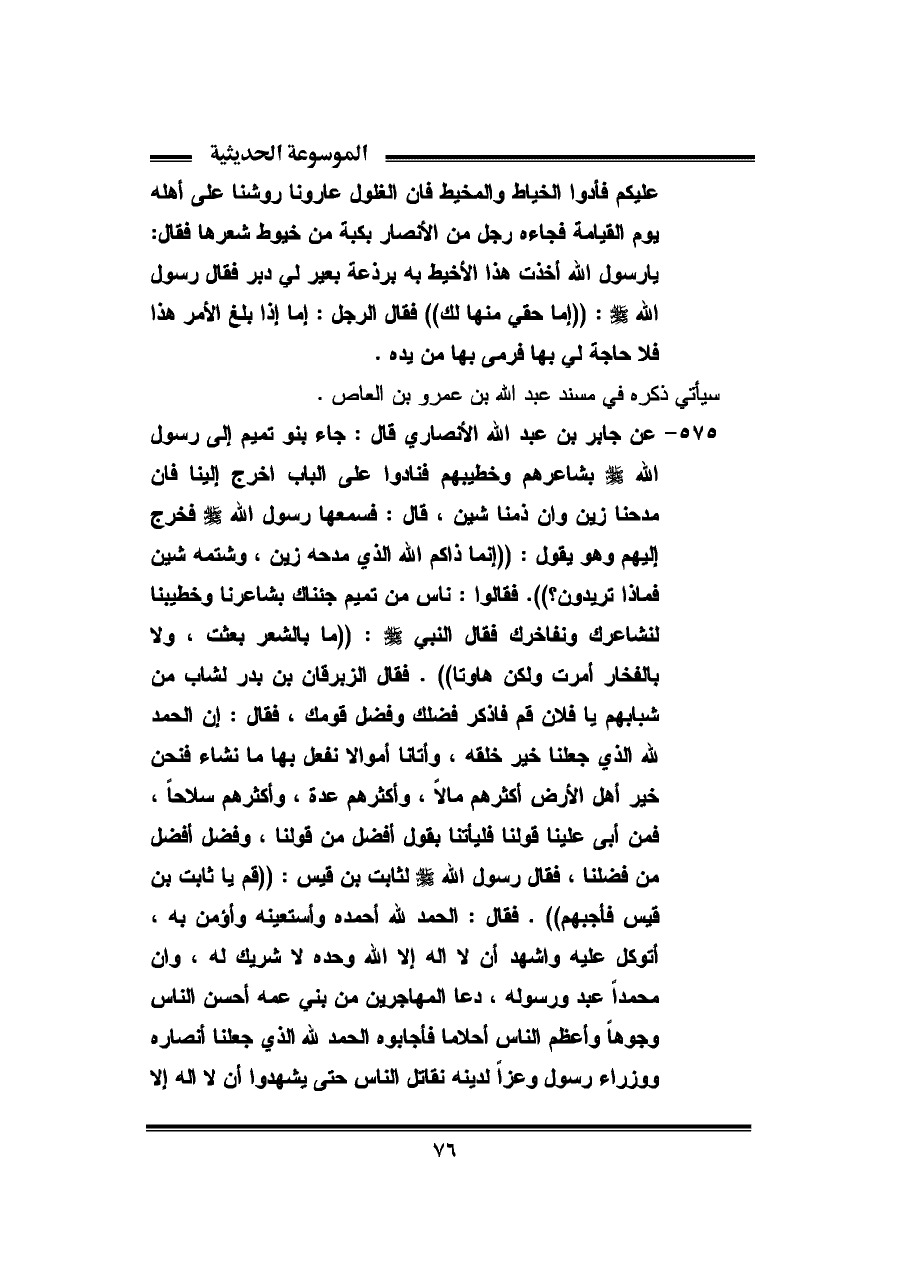 ٥٧٥ - عن جابر بن عبد الله الأنصاري قال: جاء بنو تميم إلى رسول الله - صلى الله عليه وسلم - بشاعرهم وخطيبهم فنادوا على الباب اخرج إلينا فإن مدحنا زين وإن ذمنا شين، قال: فسمعها رسول الله - صلى الله عليه وسلم - فخرج إليهم وهو يقول: "إنما ذاكم الله الذي مدحه زين، وشتمه شين فماذا تريدون؟ ". فقالوا: ناس من تميم جئناك بشاعرنا وخطيبنا لنشاعرك ونفاخرك فقال النبى - صلى الله عليه وسلم -: "ما بالشعر بعثت، ولا بالفخار أمرت ولكن هاوتا". فقال الزبرقان بن بدر لشاب من شبابهم يا فلان قم فاذكر فضلك وفضل قومك، فقال: إن الحمد لله الذي جعلنا خير خلقه، وأتانا أَموالا نفعل بها ما نشاء فنحن خير أهل الأرض أكثرهم مالاً، وأكثرهم عدة، وأكثرهم سلاحاً، فمن أبى علينا قولنا فليأتنا بقول أفضل من قولنا، وفضل أفضل من فضلنا، فقال رسول الله - صلى الله عليه وسلم - لثابت بن قيس: "قم يا ثابت بن قيس فأجبهم". فقال: الحمد لله أحمده وأستعينه وأؤمن به، أتوكل عليه وأشهد أن لا له إلا الله وحده لا شريك له، وأن محمداً عبده ورسوله، دعا المهاجرين من بنى عمه أحسن الناس وجوهاً وأعظم الناس أحلاما فأجابوه الحمد لله الذي جعلنا أنصاره ووزراء رسول وعزاً لدينه نقاتل الناس حتى يشهدوا أن لا إله إلا