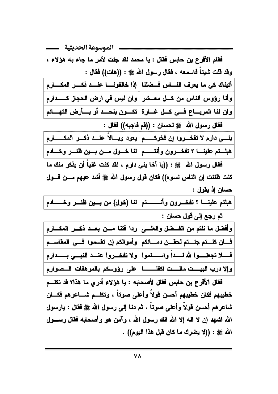 فقال رسول الله - صلى الله عليه وسلم -: "يا أخا بني دارم، لقد كنت غنياً أن يذكر منك ما كنت ظننت إن الناس نسوه" فكان قول رسول الله - صلى الله عليه وسلم - أشد عليهم من قول حسان إذ يقول: