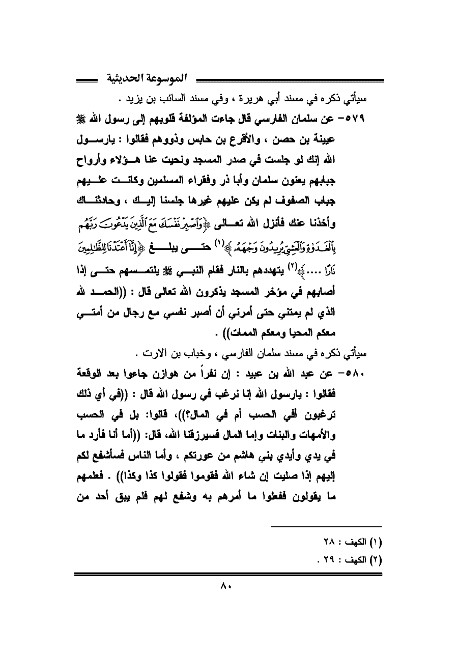 ٥٧٩ - عن سلمان الفارسى قال جاءت المؤلفة قلوبهم إلى رسول الله - صلى الله عليه وسلم - عيينة بن حصن، والأقرع بن حابس وذووهم فقالوا: يا رسول الله إنك لو جلست فى صدر المسجد ونحيت عنا هؤلاء وأرواح جبابهم يعنون سلمان وأبا ذر وفقراء المسلمين وكانت عليهم جباب الصفوف لم يكن عليهم غيرها جلسنا إليك، وحادثناك وأخذنا عنك فأنزل الله تعالى {وَاصْبِرْ نَفْسَكَ مَعَ الَّذِينَ يَدْعُونَ رَبَّهُمْ بِالْغَدَاةِ وَالْعَشِيِّ يُرِيدُونَ وَجْهَهُ} (¬١) حتى يبلغ {إِنَّا أَعْتَدْنَا لِلظَّالِمِينَ نَارًا} (¬٢) يتهددهم بالنار فقام النبى - صلى الله عليه وسلم - يلتمسهم حتى إذا أصابهم فى مؤخر المسجد يذكرون الله تعالى قال: "الحمد لله الذي لم يمتنى حتى أمرنى أن أصبر نفسي مع رجال من أمتى معكم المحيا ومعكم الممات".