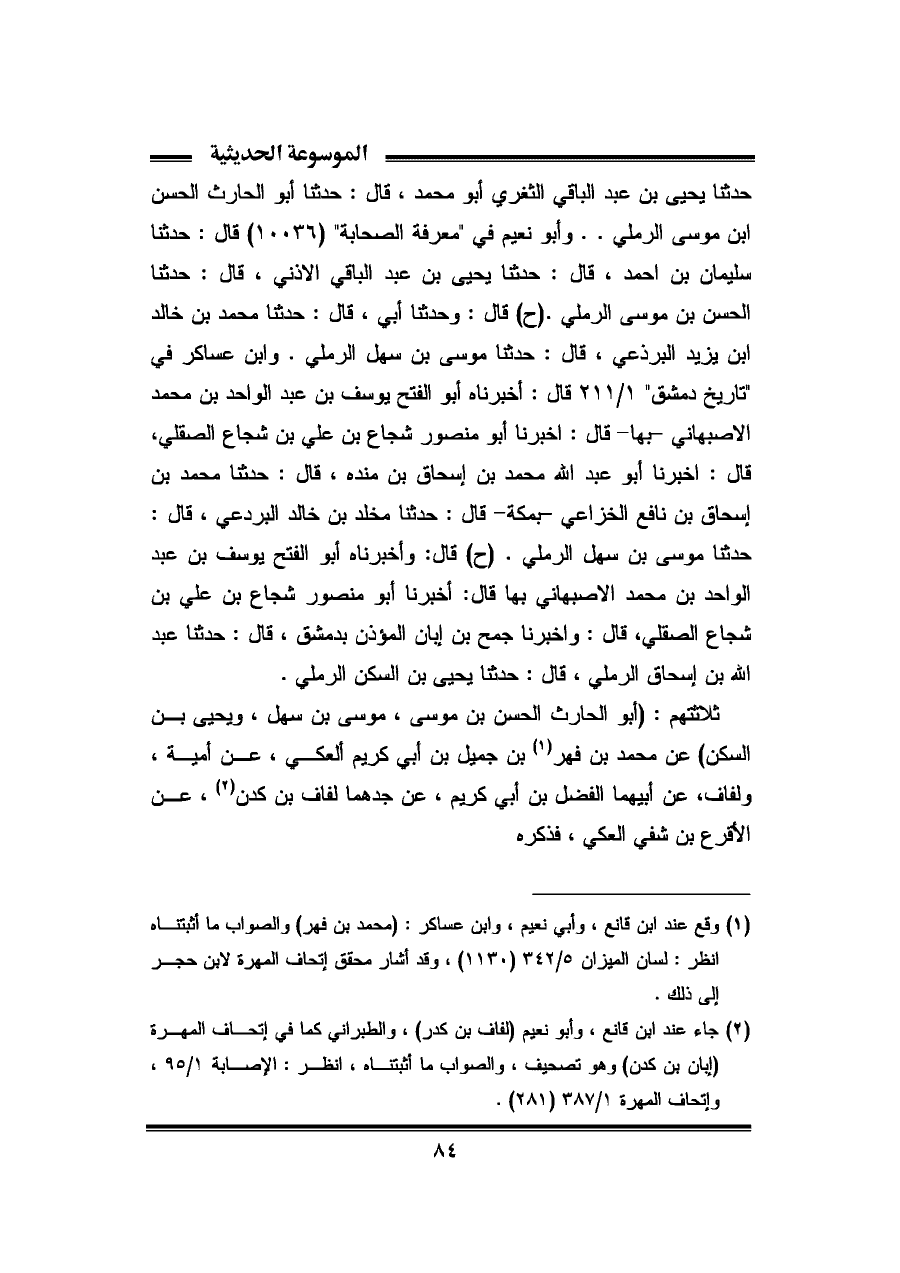 (¬١) وقع وعند ابن قانع، وأبي نعيم، وابن عساكر: (محمد بن فهر) والصواب ما أثبتناه انظر: لسان الميزان ٥/ ٣٤٢ (١١٣٠)، وقد أشار محقق إتحات المهرة لابن حجر إلى ذلك.