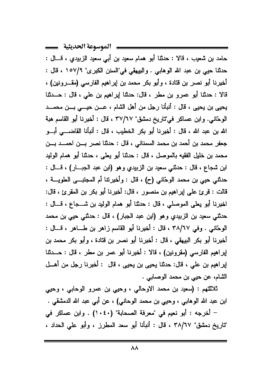 حامد بن شعيب، قالا: حدثنا أبو همام سعيد بن أبي سعيد الزبيدي، قال: حدثنا حيي بن عبد الله الوهابي. والبيهقى في "السنن الكبرى" ١٥٧/ ٩، قال: أخبرنا أبو نصر بن قتادة، وأبو بكر محمد بن إبراهيم الفارسي (مقرونين)، قالا: حدثنا أبو عمرو بن مطر، قال: حدثنا إبراهيم بن علي، قال: حدثنا يحيى بن يحيى، قال: أنبأنا رجل من أهل الشام، عن حيي بن محمد الوحّاني. وابن عساكر في "تاريخ دمشق " ٦٧/ ٣٧، قال: أخبرنا أبو القاسم هبة الله بن عبد الله، قال: أخبرنا أبو بكر الخطيب، قال: أنبأنا القاضي أبو جعفر محمد بن أحمد بن محمد السمناني، قال: حدثنا نصر بن أحمد بن محمد بن خليل الفقيه بالموصل، قال: حدثنا أبو يعلى، حدثنا أبو همام الوليد ابن شجاع، قال: حدثني سعيد بن الزبيدي وهو (ابن عبد الجبار)، قال: حدثني حيي بن محمد الوحّاني (ح)، قال: وأخبرتنا أم المجتبى العلوية، قالت: قرئ على إبراهيم بن منصور، قال: أخبرنا أبو بكر بن المقرئ، قال: أخبرنا أبو يعلى الموصلي، قال: حدثنا أبو همام الوليد بن شجاع، قال: حدثني سعيد بن الزبيدي وهو (ابن عبد الجبار)، قال: حدثني حيي بن محمد الوحّاني. وفي ٦٧/ ٣٨، قال: أخبرنا أبو القاسم زاهر بن طاهر، قال: أخبرنا أبو بكر البيهقي، قال: أخبرنا أبو نصر بن قتادة، وأبو بكر محمد بن إبراهيم الفارسي (مقرونين)، قالا: أخبرنا أبو عمر بن مطر، قال: حدثنا إبراهيم بن علي، قال: حدثنا يحيى بن يحيى، قال: أخبرنا رجل من أهل الشام، عن حيي بن محمد الوصابي.