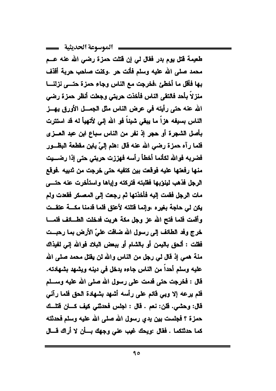 طعيمة قتل يوم بدر فقال لى إن قتلت حمزة رضي الله عنه عم محمد صلى الله عليه وسلم فأنت حر. وكنت صاحب حربة أقذف بها فأقل ما أخطئ، فخرجت مع الناس وجاء حمزة حتى نزلنا منزلاً بأحد فالتقى الناس فأخذت حربتى وجعلت أنظر حمزة رضى الله عنه حتى رأيته فى عرض الناس مثل الجمل الأورق يهز الناس بسيفه هزاً ما يبقى شيئاً فوالله إنى لأتهيأ له قد استترت بأصل الشجرة أو حجر إذ نفر من الناس سباع ابن عبد العزى فلما رآه حمزة رضي الله عنه قال: هلم إلىّ يابن مقطعة البظور فضربه فوالله لكأنما أخطأ رأسه فهززت حربتي حتى إذا رضيت منها رفعتها عليه فوقعت بين كتفيه حتى خرجت من ثدييه. فوقع الرجل فذهب لينؤبها فقلبته فتركته وإياها واستأخرت عنه حتى مات الرجل فقمت إليه فأخذتها ثم رجعت إلى المعسكر فقعدت ولم يكن لى حاجة بغيره، وإنما قتلته لأعتق فلما قدمنا مكة عتقت وأقمت فلما فتح الله عز وجل مكة هربت فدخلت الطائف فلما خرج وفد الطائف إلى رسول الله ضاقت علي الأرض بما رحبت فقلت: الحق باليمن أو بالشام أو ببعض البلاد فوالله إنى لفيذاك منة همى إذ قال لى رجل من الناس والله لن يقتل محمد صلى الله عليه وسلم أحداً من الناس جاءه يدخل فى دينه ويشهد بشهادته. قال: فخرجت حتى قدمت على رسول الله صلى الله عليه وسلم فلم يرعه إلا وبي قائم على رأسه أشهد بشهادة الحق فلما رآني قال: وحشى. قلت: نعم. قال: اجلس فحدثنى كيف كان قتلك حمزة؟ فجلست بين يدي رسول الله صلى الله عليه وسلم فحدثته كما حدثتكما. فقال: ويحك غيب عنى وجهك بأن لا أراك قال