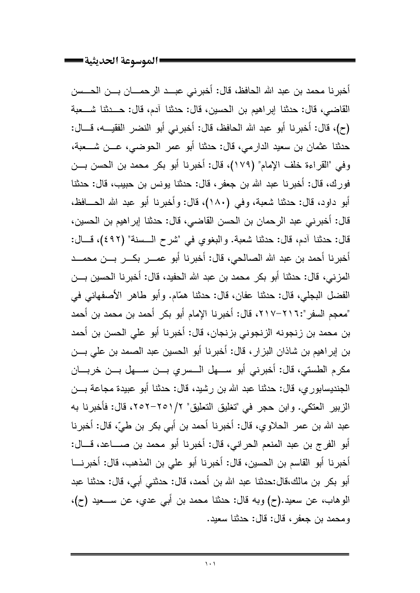 أخبرنا محمد بن عبد اللَّه الحافظ، قال: أخبرني عبد الرحمان بن الحسن القاضي، قال: حدثنا إبراهيم بن الحسين، قال: حدثنا آدم، قال: حدثنا شعبة (ح)، قال: أخبرنا أبو عبد اللَّه الحافظ، قال: أخبرني أبو النضر الفقيه، قال: حدثنا عثمان بن سعيد الدارمي، قال: حدثنا أبو عمر الحوضي، عن شعبة، وفي "القراءة خلف الإمام" (١٧٩)، قال: أخبرنا أبو بكر محمد بن الحسن بن فورك، قال: أخبرنا عبد اللَّه بن جعفر، قال: حدثنا يونس بن حبيب، قال: حدثنا أبو داود، قال: حدثنا شعبة، وفي (١٨٠)، قال: وأخبرنا أبو عبد اللَّه الحافظ، قال: أخبرني عبد الرحمان بن الحسن القاضي، قال: حدثنا إبراهيم بن الحسين، قال: حدثنا آدم، قال: حدثنا شعبة. والبغوي في "شرح السنة" (٤٩٢)، قال: أخبرنا أحمد بن عبد اللَّه الصالحي، قال: أخبرنا أبو عمر بكر بن محمد المزني، قال: حدثنا أبو بكر محمد بن عبد اللَّه الحفيد، قال: أخبرنا الحسين بن الفضل البجلي، قال: حدثنا عفان، قال: حدثنا همّام. وأبو طاهر الأصفهاني في "معجم السفر": ٢١٦ - ٢١٧، قال: أخبرنا الإمام أبو بكر أحمد بن محمد بن أحمد بن محمد بن زنجونه الزنجوني بزنجان، قال: أخبرنا أبو علي الحسن بن أحمد بن إبراهيم بن شاذان البزار، قال: أخبرنا أبو الحسين عبد الصمد بن علي بن مكرم الطستي، قال: أخبرني أبو سهل السري بن سهل بن خربان الجنديسابوري، قال: حدثنا عبد اللَّه بن رشيد، قال: حدثنا أبو عبيدة مجاعة بن الزبير العتكي. وابن حجر في "تغليق التعليق" ٢/ ٢٥١ - ٢٥٢، قال: فأخبرنا به عبد اللَّه بن عمر الحلاوي، قال: أخبرنا أحمد بن أبي بكر بن طيّ، قال: أخبرنا أبو الفرج بن عبد المنعم الحراني، قال: أخبرنا أبو محمد بن صاعد، قال: أخبرنا أبو القاسم بن الحسين، قال: أخبرنا أبو علي بن المذهب، قال: أخبرنا أبو بكر بن مالك، قال: حدثنا عبد اللَّه بن أحمد، قال: حدثني أبي، قال: حدثنا عبد الوهاب، عن سعيد. (ح) وبه قال: حدثنا محمد بن أبي عدي، عن سعيد (ح)، ومحمد بن جعفر، قال: قال: حدثنا سعيد.