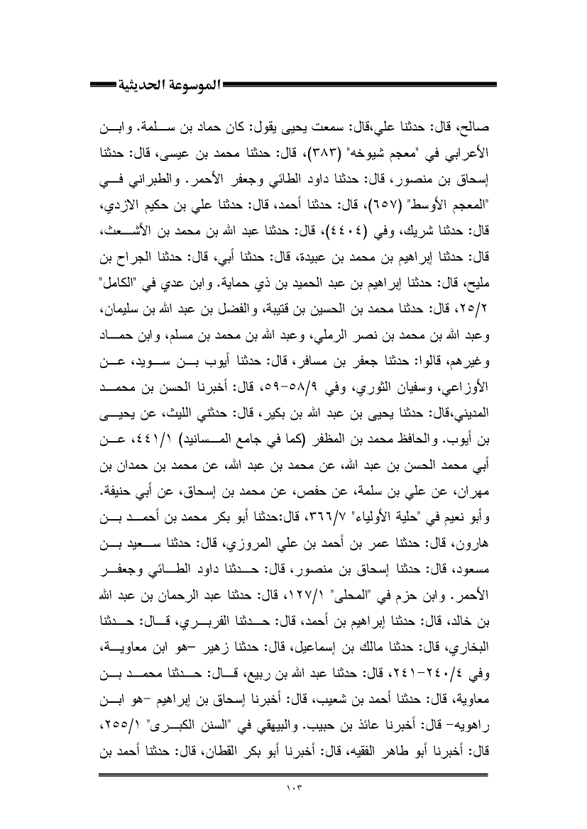 صالح، قال: حدثنا علي، قال: سمعت يحيى يقول: كان حماد بن سلمة. وابن الأعرابي في "معجم شيوخه" (٣٨٣)، قال: حدثنا محمد بن عيسى، قال: حدثنا إسحاق بن منصور، قال: حدثنا داود الطائي وجعفر الأحمر. والطبراني في "المعجم الأوسط" (٦٥٧)، قال: حدثنا أحمد، قال: حدثنا علي بن حكيم الأزدي، قال: حدثنا شريك، وفي (٤٤٠٤)، قال: حدثنا عبد اللَّه بن محمد بن الأشعث، قال: حدثنا إبراهيم بن محمد بن عبيدة، قال: حدثنا أبي، قال: حدثنا الجراح بن مليح، قال: حدثنا إبراهيم بن عبد الحميد بن ذي حماية. وابن عدي في "الكامل" ٢/ ٢٥، قال: حدثنا محمد بن الحسين بن قتيبة، والفضل بن عبد اللَّه بن سليمان، وعبد اللَّه بن محمد بن نصر الرملي، وعبد اللَّه بن محمد بن مسلم، وابن حماد وغيرهم، قالوا: حدثنا جعفر بن مسافر، قال: حدثنا أيوب بن سويد، عن الأوزاعي، وسفيان الثوري، وفي ٩/ ٥٨ - ٥٩، قال: أخبرنا الحسن بن محمد المديني، قال: حدثنا يحيى بن عبد اللَّه بن بكير، قال: حدثني الليث، عن يحيى بن أيوب. والحافظ محمد بن المظفر (كما في جامع المسانيد) ١/ ٤٤١، عن أبي محمد الحسن بن عبد اللَّه، عن محمد بن عبد اللَّه، عن محمد بن حمدان بن مهران، عن علي بن سلمة، عن حفص، عن محمد بن إسحاق، عن أبي حنيفة. وأبو نعيم في "حلية الأولياء" ٧/ ٣٦٦، قال: حدثنا أبو بكر محمد بن أحمد بن هارون، قال: حدثنا عمر بن أحمد بن علي المروزي، قال: حدثنا سعيد بن مسعود، قال: حدثنا إسحاق بن منصور، قال: حدثنا داود الطائي وجعفر الأحمر. وابن حزم في "المحلى" ١/ ١٢٧، قال: حدثنا عبد الرحمان بن عبد اللَّه بن خالد، قال: حدثنا إبراهيم بن أحمد، قال: حدثنا الفربري، قال: حدثنا البخاري، قال: حدثنا مالك بن إسماعيل، قال: حدثنا زهير - هو ابن معاوية، وفي ٤/ ٢٤٠ - ٢٤١، قال: حدثنا عبد اللَّه بن ربيع، قال: حدثنا محمد بن معاوية، قال: حدثنا أحمد بن شعيب، قال: أخبرنا إسحاق بن إبراهيم -هو ابن راهويه- قال: أخبرنا عائذ بن حبيب. والبيهقي في "السنن الكبرى" ١/ ٢٥٥، قال: أخبرنا أبو طاهر الفقيه، قال: أخبرنا أبو بكر القطان، قال: حدثنا أحمد بن