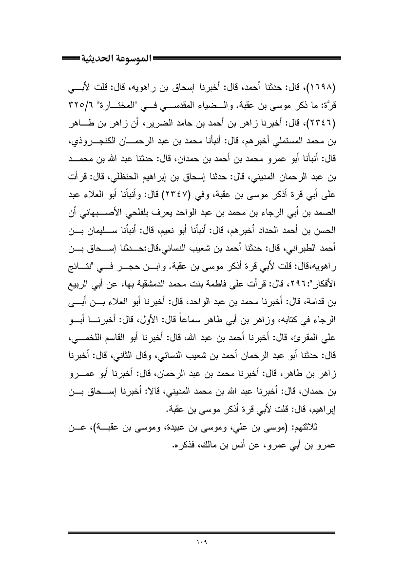 (١٦٩٨)، قال: حدثنا أحمد، قال: أخبرنا إسحاق بن راهويه، قال: قلت لأبي قرَّة: ما ذكر موسى بن عقبة. والضياء المقدسي في "المختارة" ٦/ ٣٢٥ (٢٣٤٦)، قال: أخبرنا زاهر بن أحمد بن حامد الضرير، أن زاهر بن طاهر بن محمد المستملي أخبرهم، قال: أنبأنا محمد بن عبد الرحمان النجروذي، قال: أنبأنا أبو عمرو محمد بن أحمد بن حمدان، قال: حدثنا عبد اللَّه بن محمد بن عبد الرحمان المديني، قال: حدثنا إسحاق بن إبراهيم الحنظلي، قال: قرأت على أبي قرة أذكر موسى بن عقبة، وفي (٢٣٤٧) قال: وأنبأنا أبو العلاء عبد الصمد بن أبي الرجاء بن محمد بن عبد الواحد يعرف بلفلحي الأصبهاني أن الحسن بن أحمد الحداد أخبرهم، قال: أنبأنا أبو نعيم، قال: أنبأنا سليمان بن أحمد الطبراني، قال: حدثنا أحمد بن شعيب النسائي، قال: حدثنا إسحاق بن راهويه، قال: قلت لأبي قرة أذكر موسى بن عقبة. وابن حجر في "نتائج الأفكار": ٢٩٦، قال: قرأت على فاطمة بنت محمد الدمشقية بها، عن أبي الربيع بن قدامة، قال: أخبرنا محمد بن عبد الواحد، قال: أخبرنا أبو العلاء بن أبي الرجاء في كتابه، وزاهر بن أبي طاهر سماعًا قال: الأول، قال: أخبرنا أبو علي المقرئ، قال: أخبرنا أحمد بن عبد اللَّه، قال: أخبرنا أبو القاسم اللخمي، قال: حدثنا أبو عبد الرحمان أحمد بن شعيب النسائي، وقال الثاني، قال: أخبرنا زاهر بن طاهر، قال: أخبرنا محمد بن عبد الرحمان، قال: أخبرنا أبو عمرو بن حمدان، قال: أخبرنا عبد اللَّه بن محمد المديني، قالا: أخبرنا إسحاق بن إبراهيم، قال: قلت لأبي قرة أذكر موسى بن عقبة.