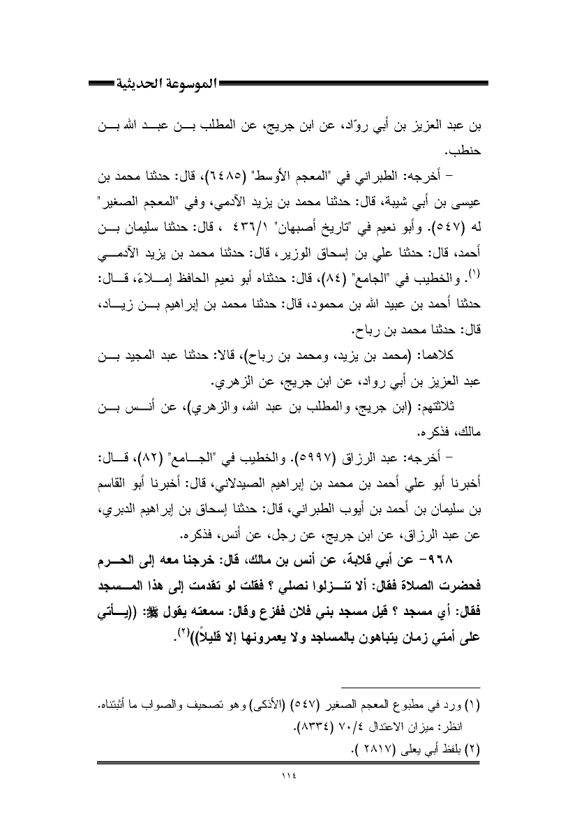 ٩٦٨ - عن أبي قلابة، عن أنس بن مالك، قال: خرجنا معه إلى الحرم فحضرت الصلاة فقال: ألا تنزلوا نصلي؟ فقلت لو تقدمت إلى هذا المسجد فقال: أي مسجد؟ فيل مسجد بني فلان ففزع وقال: سمعته يقول -صلى اللَّه عليه وسلم-: "يأتي على أمتي زمان يتباهون بالمساجد ولا يعمرونها إلا قليلًا" (¬٢).