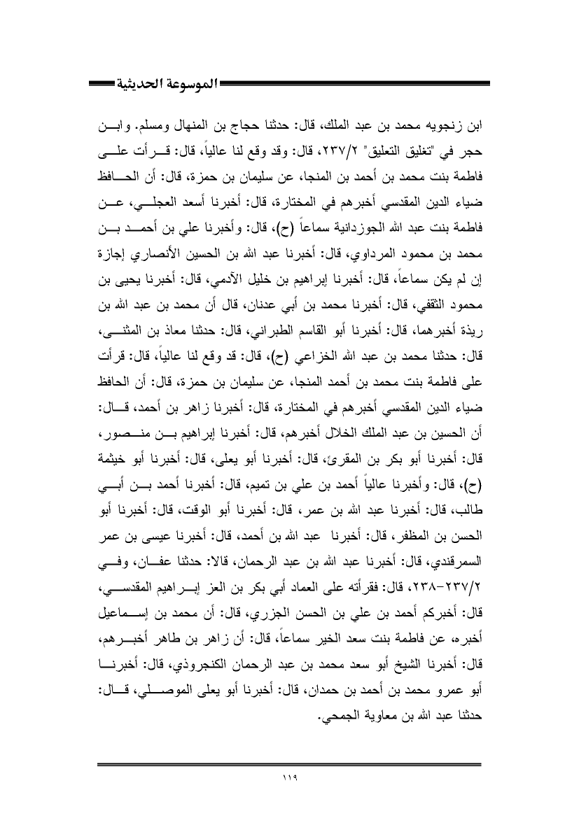 ابن زنجويه محمد بن عبد الملك، قال: حدثنا حجاج بن المنهال ومسلم. وابن حجر في "تغليق التعليق" ٢/ ٢٣٧، قال: وقد وقع لنا عاليًا، قال: قرأت على فاطمة بنت محمد بن أحمد بن المنجا، عن سليمان بن حمزة، قال: أن الحافظ ضياء الدين المقدسي أخبرهم في المختارة، قال: أخبرنا أسعد العجلي، عن فاطمة بنت عبد اللَّه الجوزدانية سماعًا (ح)، قال: وأخبرنا علي بن أحمد بن محمد بن محمود المرداوي، قال: أخبرنا عبد اللَّه بن الحسين الأنصاري إجازة إن لم يكن سماعًا، قال: أخبرنا إبراهيم بن خليل الآدمي، قال: أخبرنا يحيى بن محمود الثقفي، قال: أخبرنا محمد بن أبي عدنان، قال أن محمد بن عبد اللَّه بن ريذة أخبرهما، قال: أخبرنا أبو القاسم الطبراني، قال: حدثنا معاذ بن المثنى، قال: حدثنا محمد بن عبد اللَّه الخزاعي (ح)، قال: قد وقع لنا عاليًا، قال: قرأت على فاطمة بنت محمد بن أحمد المنجا، عن سليمان بن حمزة، قال: أن الحافظ ضياء الدين المقدسي أخبرهم في المختارة، قال: أخبرنا زاهر بن أحمد، قال: أن الحسين بن عبد الملك الخلال أخبرهم، قال: أخبرنا إبراهيم بن منصور، قال: أخبرنا أبو بكر بن المقرئ، قال: أخبرنا أبو يعلى، قال: أخبرنا أبو خيثمة (ح)، قال: وأخبرنا عاليًا أحمد بن علي بن تميم، قال: أخبرنا أحمد بن أبي طالب، قال: أخبرنا عبد اللَّه بن عمر، قال: أخبرنا أبو الوقت، قال: أخبرنا أبو الحسن بن المظفر، قال: أخبرنا عبد اللَّه بن أحمد، قال: أخبرنا عيسى بن عمر السمرقندي، قال: أخبرنا عبد اللَّه بن عبد الرحمان، قالا: حدثنا عفان، وفي ٢/ ٢٣٧ - ٢٣٨، قال: فقرأته على العماد أبي بكر بن العز إبراهيم المقدسي، قال: أخبركم أحمد بن علي بن الحسن الجزري، قال: أن محمد بن إسماعيل أخبره، عن فاطمة بنت سعد الخير سماعًا، قال: أن زاهر بن طاهر أخبرهم، قال: أخبرنا الشيخ أبو سعد محمد بن عبد الرحمان الكنجروذي، قال: أخبرنا أبو عمرو محمد بن أحمد بن حمدان، قال: أخبرنا أبو يعلى الموصلي، قال: حدثنا عبد اللَّه بن معاوية الجمحي.