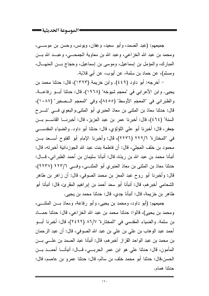 جميعهم: (عبد الصمد، وأبو سعيد، وعفان، ويونس، وحسن بن موسى، ومحمد بن عبد اللَّه الخزاعي، وعبد اللَّه بن معاوية الجمحي، وعبد اللَّه بن المبارك، والمؤمل بن إسماعيل، وموسى بن إسماعيل، وحجاج بن المنهال، ومسلم)، عن حماد بن سلمة، عن أيوب، عن أبي قلابة.