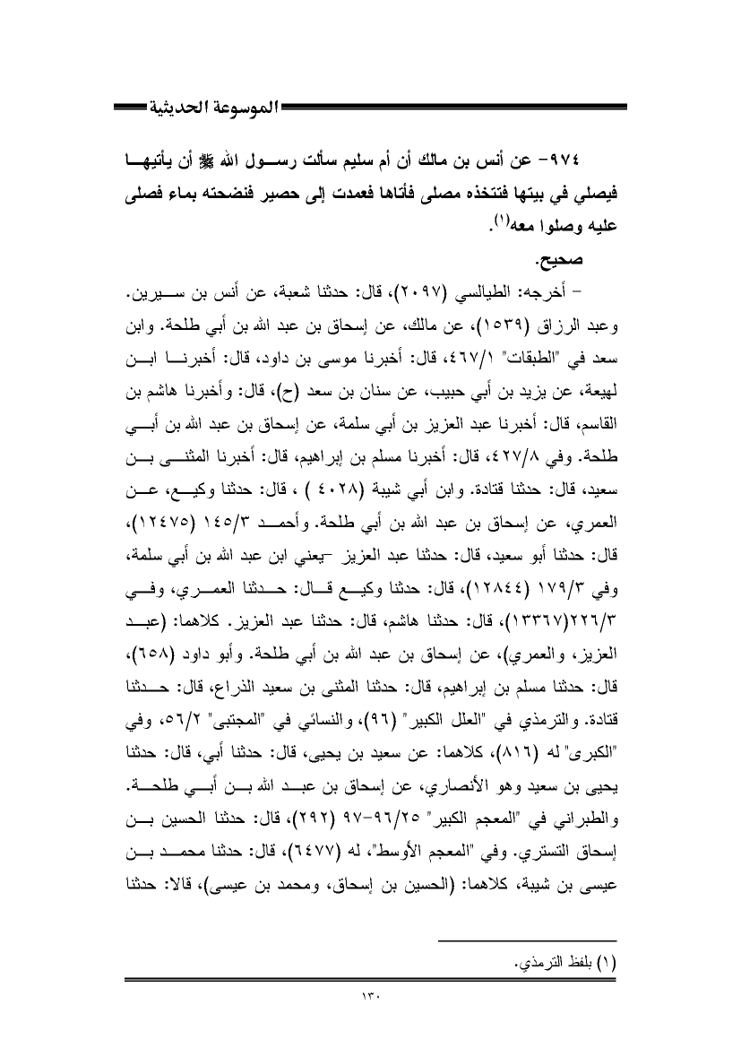 ٩٧٤ - عن أنس بن مالك أن أم سليم سألت رسول اللَّه -صلى اللَّه عليه وسلم- أن يأتيها فيصلي في بيتها فتتخذه مصلى فأتاها فعمدت إلى حصير فنضحته بماء فصلى عليه وصلوا معه (¬١).