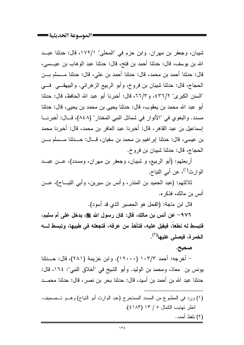 شيبان، وجعفر بن مهران. وابن حزم في "المحلى" ١/ ١٧٢، قال: حدثنا عبد اللَّه بن يوسف، قال: حدثنا أحمد بن فتح، قال: حدثنا عبد الوهاب بن عيسى، قال: حدثنا أحمد بن محمد، قال: حدثنا أحمد بن علي، قال: حدثنا مسلم بن الحجاج، قال: حدثنا شيبان بن فروخ، وأبو الربيع الزهراني. والبيهقي في "السنن الكبرى" ٢/ ٤٣٦، و ٣/ ٦٦، قال: أخبرنا أبو عبد اللَّه الحافظ، قال: حدثنا أبو عبد اللَّه محمد بن يعقوب، قال: حدثنا يحيى بن محمد بن يحيى، قال: حدثنا مسدد. والبغوي في "الأنوار في شمائل النبي المختار" (٨٤٨)، قال: أخبرنا إسماعيل بن عبد القاهر، قال: أخبرنا عبد الغافر بن محمد، قال: أخبرنا محمد بن عيسى، قال: حدثنا إبراهيم بن محمد بن سفيان، قال: حدثنا مسلم بن الحجاج، قال: حدثنا شيبان بن فروخ.