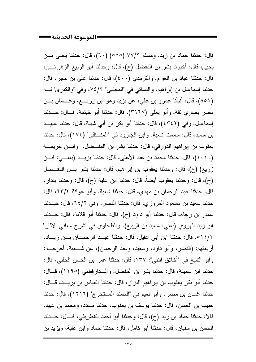 قال: حدثنا حماد بن زيد. ومسلم ٢/ ٧٧ (٥٥٥) (٦٠)، قال: حدثنا يحيى بن يحيى، قال: أخبرنا بشر بن المفضل (ح)، قال: وحدثنا أبو الربيع الزهراني، قال: حدثنا عباد بن العوام. والترمذي (٤٠٠)، قال: حدثنا علي بن حجر، قال: حدثنا إسماعيل بن إبراهيم. والنسائي في "المجتبى" ٢/ ٧٤، وفي "الكبرى" له (٨٥١)، قال: أنبأنا عمرو بن علي، عن يزيد وهو ابن زريع، وغسان بن مضر بصري ثقة. وأبو يعلى (٣٦٦٧)، قال: حدثنا أبو خيثمة، قال: حدثنا إسماعيل. وفي (٤٣٤٢)، قال: حدثنا أبو بكر بن أبي شيبة، قال: حدثنا عبيد بن سعيد، قال: سمعت شعبة. وابن الجارود في "المنتقى" (١٧٤)، قال: حدثنا يعقوب بن إبراهيم الدورقي، قال: حدثنا بشر بن المفضل. وابن خزيمة (١٠١٠)، قال: حدثنا محمد بن عبد الأعلى، قال: حدثنا يزيد (يعني: ابن زريع) (ح)، قال: وحدثنا يعقوب بن إبراهيم، قال: حدثنا بشر بن المفضل (ح)، قال: وحدثنا يعقوب أيضًا، قال: حدثنا ابن علية (ح)، قال: وحدثنا بندار، قال: حدثنا عبد الرحمان بن مهدي، قال: حدثنا شعبة. وأبو عوانة ٢/ ٦٣، قال: حدثنا سعيد بن مسعود المروزي، قال: حدثنا النضر. وفي ٢/ ٦٤، قال: حدثنا عمار بن رجاء، قال: حدثنا أبو داود (ح)، قال: حدثنا أبو قلابة، قال: حدثنا أبو زيد الهروي (يعني: سعيد بن الربيع). والطحاوي في "شرح معاني الآثار" ١/ ٥١١، قال: حدثنا ابن أبي عقيل، قال: حدثنا عبد الرحمان بن زياد. أربعتهم: (النضر، وأبو داود، وسعيد، وعبد الرحمان)، عن شعبة. أخرجه: وأبو الشيخ في "أخلاق النبي": ١٣٧، قال: حدثنا عمر بن الحسن الحلبي، قال: حدثنا ابن سمينة، قال: حدثنا بشر بن المفضل. والدارقطني (١١٩٥)، قال: حدثنا أبو بكر يعقوب بن إبراهيم البزاز، قال: حدثنا العباس بن يزيد، قال: حدثنا غسان بن مضر. وأبو نعيم في "المسند المستخرج" (١٢١٦)، قال: حدثنا حبيب بن الحسن، قال: حدثنا يوسف بن يعقوب، حدثنا مسدد، ومحمد بن عبيد، قالا: حدثنا حماد بن زيد (ح)، قال: وحدثنا أبو أحمد الغطريفي، قال: حدثنا الحسن بن سفيان، قال: حدثنا أبو كامل، قال: حدثنا حماد وابن علية، ويزيد بن