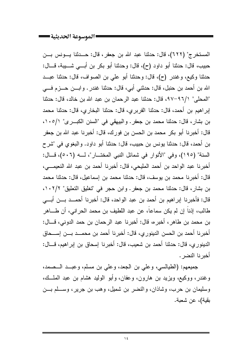 جميعهم: (الطيالسي، وعلي بن الجعد، وعلي بن مسلم، وعبد الصمد، وغندر، ووكيع، ويزيد بن هارون، وعفان، وأبو الوليد هشام بن عبد الملك، وسليمان بن حرب، وشاذان، والنضر بن شميل، وهب بن جرير، وسلم بن بقية)، عن شعبة.
