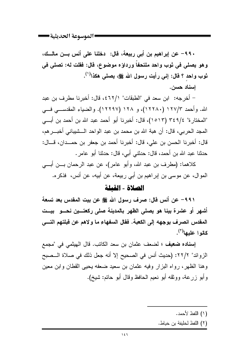 ٩٩٠ - عن إبراهيم بن أبي ربيعة، قال: دخلنا على أنس بن مالك، وهو يصلي في ثوب واحد ملتحفًا ورداؤه موضوع، قال: فقلت له: تصلي في ثوب واحدٍ؟ قال: إني رأيت رسول اللَّه -صلى اللَّه عليه وسلم-، يصلي هكذا (¬١).