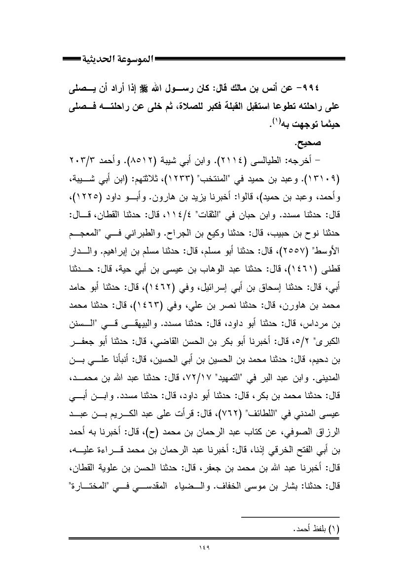 ٩٩٤ - عن أنس بن مالك قال: كان رسول اللَّه -صلى اللَّه عليه وسلم- إذا أراد أن يصلى على راحلته تطوعا استقبل القبلة فكبر للصلاة، ثم خلى عن راحلته فصلى حيثما توجهت به (¬١).