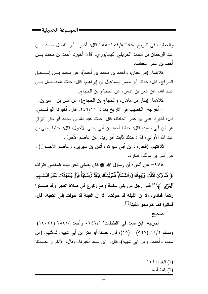 ٩٧٥ - عن أنس: أن رسول اللَّه -صلى اللَّه عليه وسلم- كان يصلي نحو بيت المقدس فنزلت {قَدْ نَرَى تَقَلُّبَ وَجْهِكَ فِي السَّمَاءِ فَلَنُوَلِّيَنَّكَ قِبْلَةً تَرْضَاهَا فَوَلِّ وَجْهَكَ شَطْرَ الْمَسْجِدِ الْحَرَامِ} (¬١) فمر رجل من بني سلمة وهم ركوع في صلاة الفجر وقد صلوا ركعة فنادى: ألا إن القبلة قد حولت، ألا إن القبلة قد حولت إلى الكعبة، قال: فمالوا كما هم نحو القبلة (¬٢).