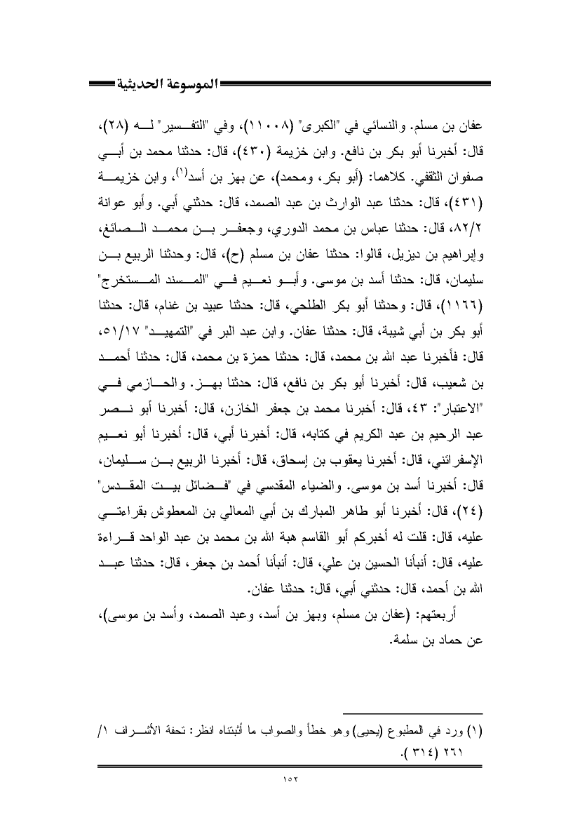 عفان بن مسلم. والنسائي في "الكبرى" (١١٠٠٨)، وفي "التفسير" له (٢٨)، قال: أخبرنا أبو بكر بن نافع. وابن خزيمة (٤٣٠)، قال: حدثنا محمد بن أبي صفوان الثقفي. كلاهما: (أبو بكر، ومحمد)، عن بهز بن أسد (¬١)، وابن خزيمة (٤٣١)، قال: حدثنا عبد الوارث بن عبد الصمد، قال: حدثني أبي. وأبو عوانة ٢/ ٨٢، قال: حدثنا عباس بن محمد الدوري، وجعفر بن محمد الصائغ، وإبراهيم بن ديزيل، قالوا: حدثنا عفان بن مسلم (ح)، قال: وحدثنا الربيع بن سليمان، قال: حدثنا أسد بن موسى. وأبو نعيم في "المسند المستخرج" (١١٦٦)، قال: وحدثنا أبو بكر الطلحي، قال: حدثنا عبيد بن غنام، قال: حدثنا أبو بكر بن أبي شيبة، قال: حدثنا عفان. وابن عبد البر في "التمهيد" ١٧/ ٥١، قال: فأخبرنا عبد اللَّه بن محمد، قال: حدثنا حمزة بن محمد، قال: حدثنا أحمد بن شعيب، قال: أخبرنا أبو بكر بن نافع، قال: حدثنا بهز. والحازمي في "الاعتبار": ٤٣، قال: أخبرنا محمد بن جعفر الخازن، قال: أخبرنا أبو نصر عبد الرحيم بن عبد الكريم في كتابه، قال: أخبرنا أبي، قال: أخبرنا أبو نعيم الإسفرائني، قال: أخبرنا يعقوب بن إسحاق، قال: أخبرنا الربيع بن سليمان، قال: أخبرنا أسد بن موسى. والضياء المقدسي في "فضائل بيت المقدس" (٢٤)، قال: أخبرنا أبو طاهر المبارك بن أبي المعالي بن المعطوش بقراءتي عليه، قال: قلت له أخبركم أبو القاسم هبة اللَّه بن محمد بن عبد الواحد قراءة عليه، قال: أنبأنا الحسين بن علي، قال: أنبأنا أحمد بن جعفر، قال: حدثنا عبد اللَّه بن أحمد، قال: حدثني أبي، قال: حدثنا عفان.