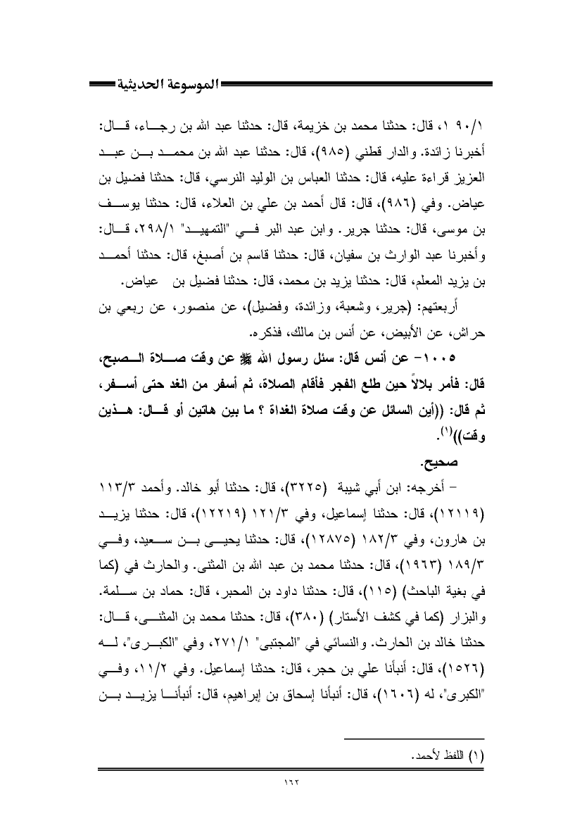 ١/ -١٩٠، قال: حدثنا محمد بن خزيمة، قال: حدثنا عبد اللَّه بن رجاء، قال: أخبرنا زائدة. والدارقطني (٩٨٥)، قال: حدثنا عبد اللَّه بن محمد بن عبد العزيز قراءة عليه، قال: حدثنا العباس بن الوليد النرسي، قال: حدثنا فضيل بن عياض. وفي (٩٨٦)، قال: قال أحمد بن علي بن العلاء، قال: حدثنا يوسف بن موسى، قال: حدثنا جرير. وابن عبد البر في "التمهيد" ١/ ٢٩٨، قال: وأخبرنا عبد الوارث بن سفيان، قال: حدثنا قاسم بن أصبغ، قال: حدثنا أحمد بن يزيد المعلم، قال: حدثنا يزيد بن محمد، قال: حدثنا فضيل بن عياض.